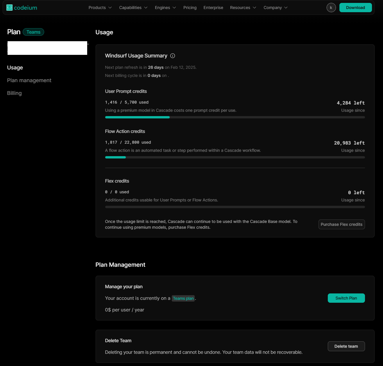 현재 Windsurf Editor는 Teams Plan이라는 무료 요금제를 제공합니다. 이 플랜은 다음과 같은 특징을 가지고 있습니다.