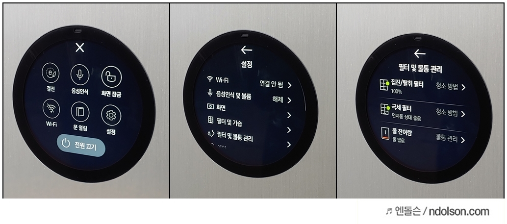 시그니처 에어 서클을 포함해 총 4개의 고성능 팬이 정면에 있고 측면의 토출구에서도 바람 나옵니다. 퀵 서클 디스플레이 설정을 통해서 간접, 직접풍, 인공지능 스마트케어 기능을 확인할 수 있었고, 좌우 토출구의 바람 켜고 끄기도 가능했습니다.