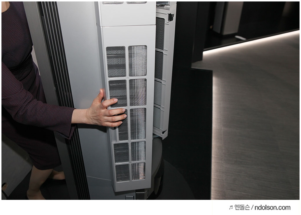 에어컨의 필터를 교환할 때도 뒤쪽으로 손이 닿지 않는 데, 리모컨에서 필터 교환 버튼을 누르면, 필터가 옆으로 열려 손이 닿기 편하게 하였네요. 지인이 보더니 트랜스포머 같이 변신한다고 한다고 놀라워하더라고요. 필터 교환할 때도 자동화되어 편의성이 돋보였습니다.