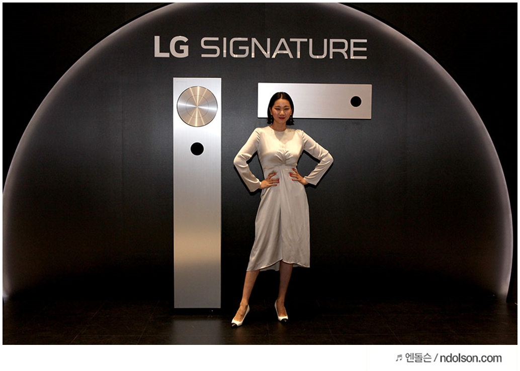 언제나 당당해 보이는 셀럽 장윤주 모델과 함께 LG SIGNATURE 에어컨을 만날 수 있었습니다. 제품이 연상되는 의상으로 매칭해주는 센스가 좋네요! 마치 시그니처의 메탈 고유의 느낌과 잘 어울리는 드레스네요.