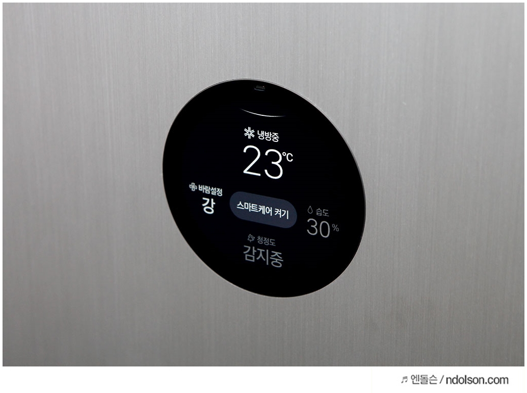 시그니처 에어 서클을 포함해 총 4개의 고성능 팬이 정면에 있고 측면의 토출구에서도 바람 나옵니다. 퀵 서클 디스플레이 설정을 통해서 간접, 직접풍, 인공지능 스마트케어 기능을 확인할 수 있었고, 좌우 토출구의 바람 켜고 끄기도 가능했습니다.