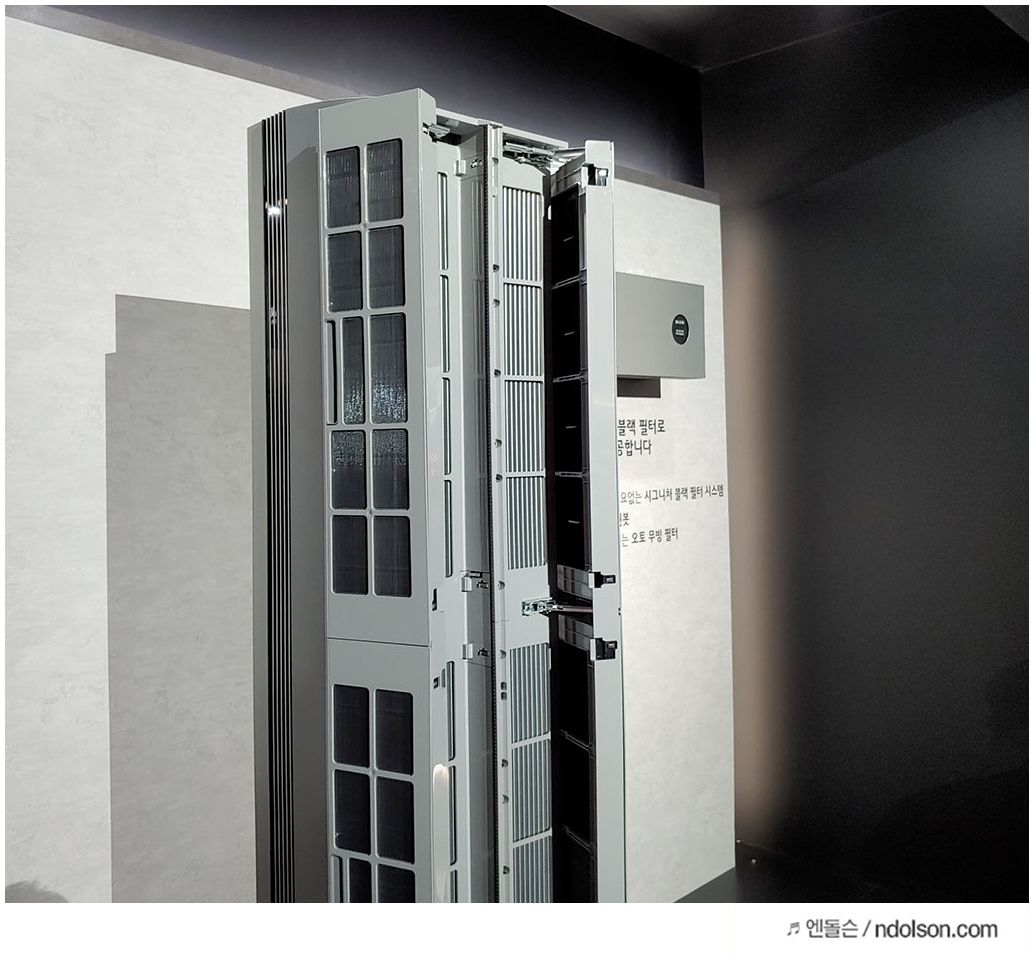 또 에어컨을 사용하다 보면, 필터에 생기는 먼지가 청소하기 귀찮은데요. 청소가 가능한 미니 로봇인 시그니처 필터 클린봇이 에어컨에 장착되어 있어 공기청정 프리필터를 자동으로 청소할 수 있게 하였습니다.
