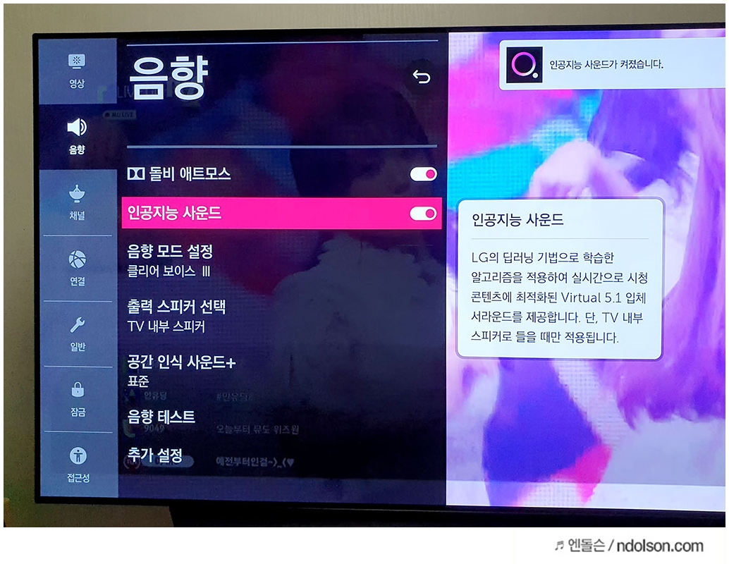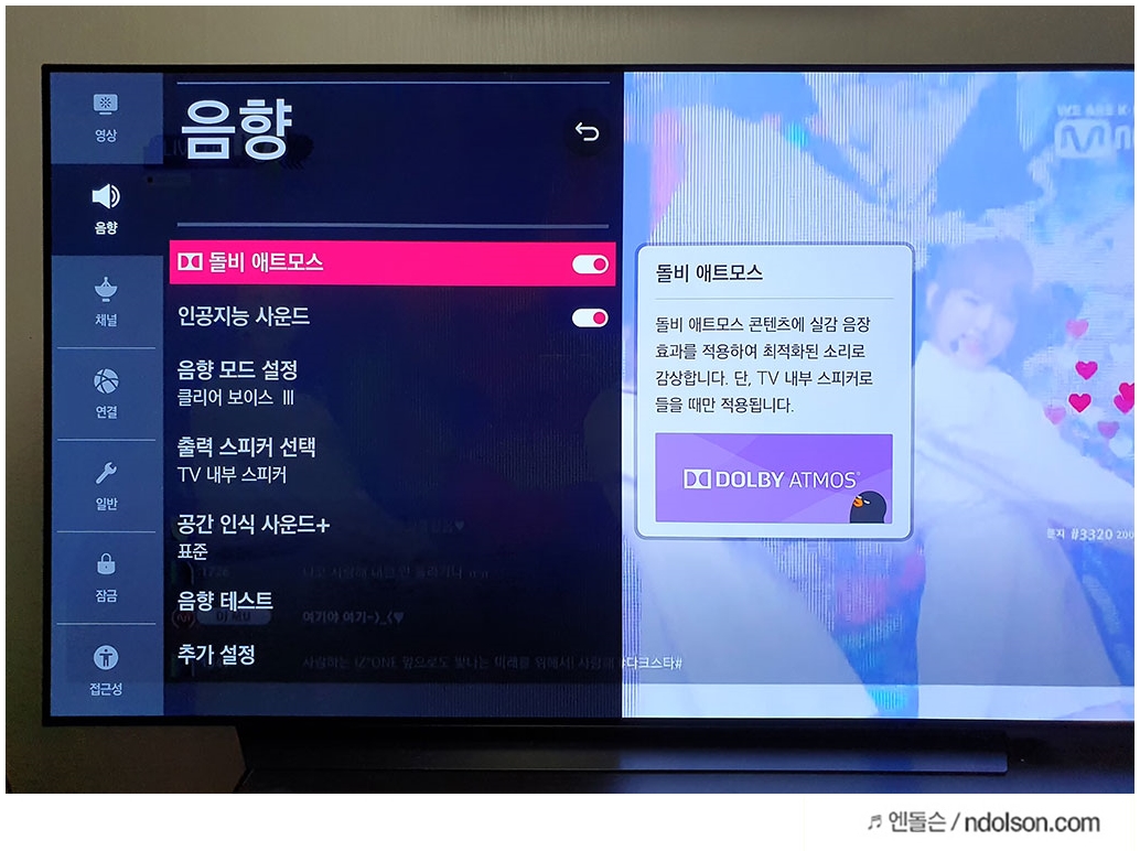 TV가 좋으니 사운드에 대해서도 많이 신경을 썼더라고요. 먼저 사진에서 보이는 것과 같이 돌비 애트모스 기능을 지원합니다. 돌비 애트모스(Dolby Atmos)는 실감 나는 음향 효과를 느끼게 해주는 끝판왕이라고 할 수 있습니다. 당연히 설정을 켜주는 게 좋더군요.