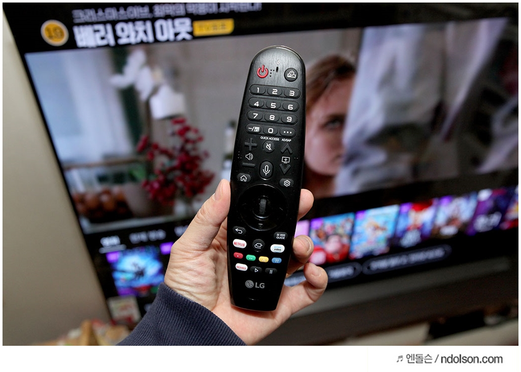 19년 LG 올레드 TV AI ThinQ가 조금 더 특별한 점은 공간 인식 사운드+ 기능인데요. 이 기능은 리모컨의 마이크를 이용하여 공간의 사운드를 분석해 이를 바탕으로 사운드를 최적화하는 기술입니다. 리모컨을 들고 있는 사용자가 어디에 있는지 인식하고 공간에 대한 튜닝을 하면서 소리의 방향을 조절하는데요. 더더욱 현장에 있는 듯한 입체적인 음향을 제공하여 참 좋습니다.