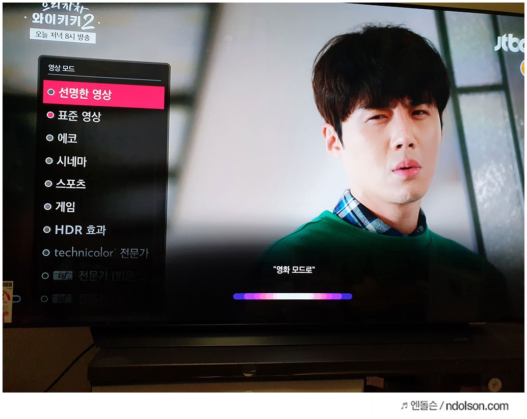 영상 모드 설정은 시네마, 게임, 선명한 영상, 에코, 스포츠 등의 설정이 가능합니다.시네마, 게임, 선명한 영상, 에코, 스포츠 등 현재 보고 있는 콘텐츠에 따라 영상 모드 설정도 가능한데요. 직접 영상 모드를 바꾸어 보면, 콘텐츠의 종류에 따라서 그 차이가 나더군요. 영상의 선명함 정도, 명암비 등 세밀한 설정이 가능한 점은 너무나도 당연합니다.