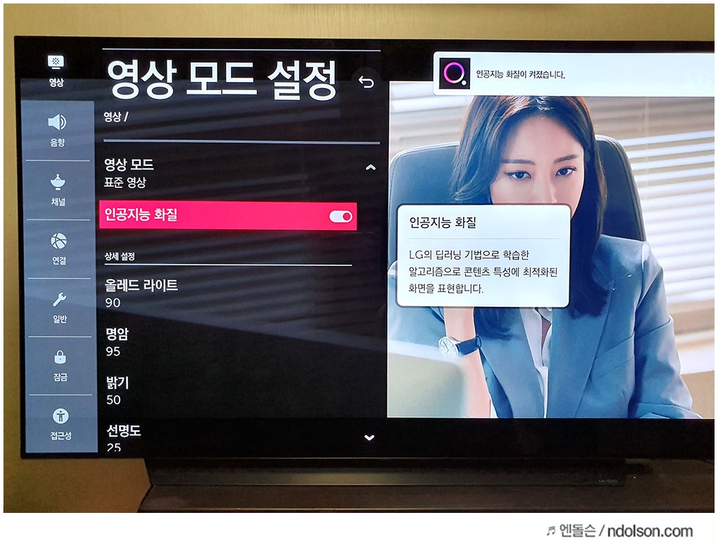 매번 보고 있는 화면에 따라 이런 설정들을 거치기 다소 귀찮을 수 있습니다. 그럴 땐 고민 없이 인공지능 화질을 ON하면, TV에 나오고 있는 콘텐츠에 따라서 알아서 시청하기 좋은 화질로 만들어 줍니다.