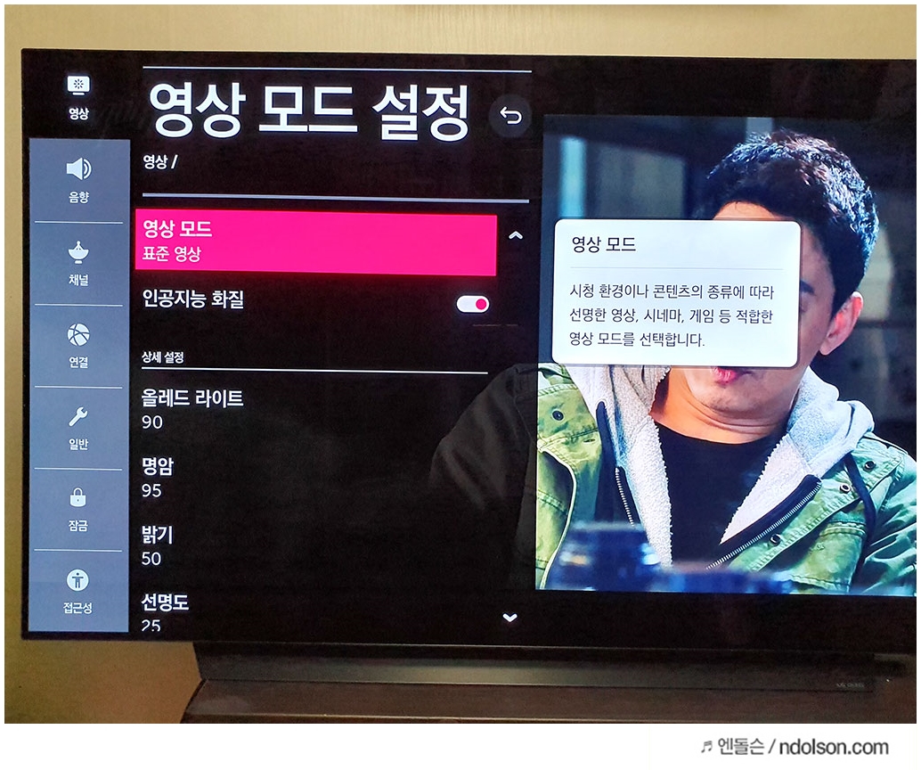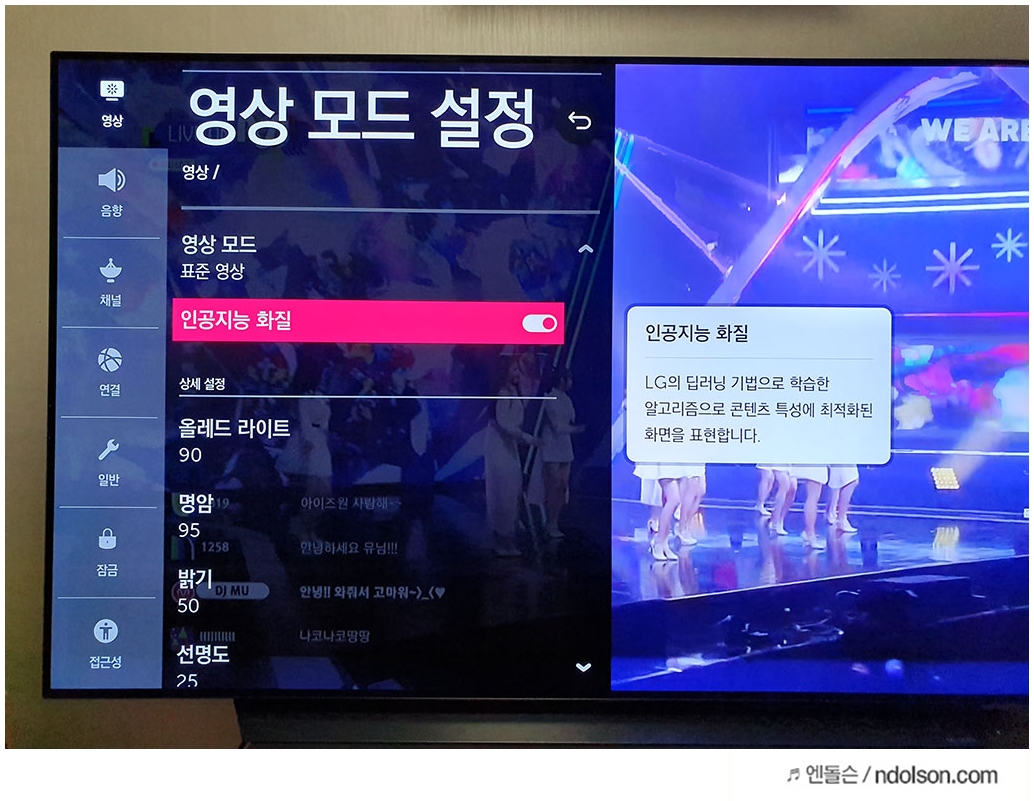 매번 보고 있는 화면에 따라 이런 설정들을 거치기 다소 귀찮을 수 있습니다. 그럴 땐 고민 없이 인공지능 화질을 ON하면, TV에 나오고 있는 콘텐츠에 따라서 알아서 시청하기 좋은 화질로 만들어 줍니다.