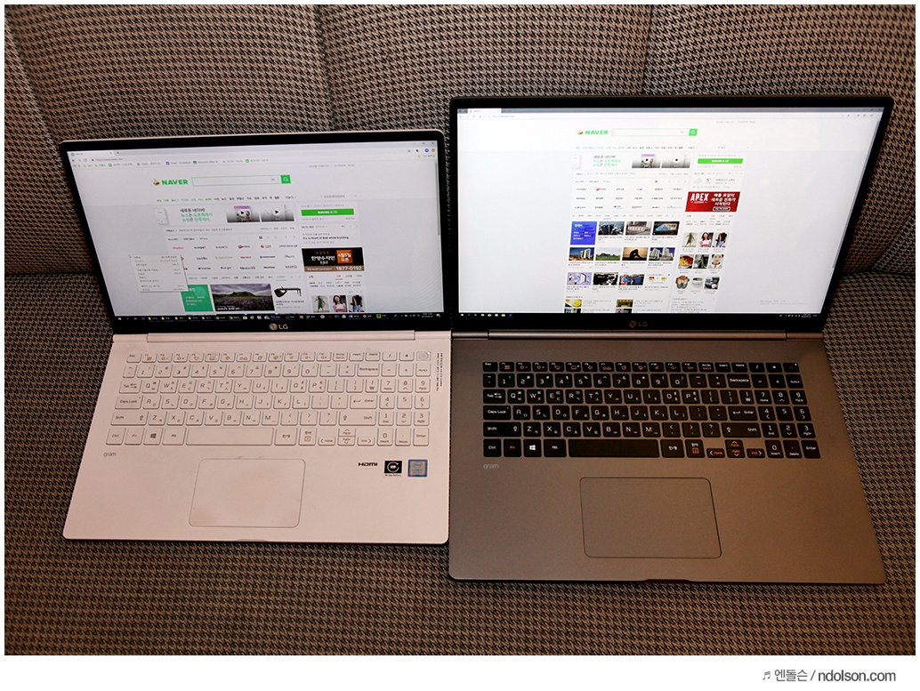 LG 그램 14 (2018년형)과 LG 그램 17을 나란히 두고 비교해 보았는데요. 14인치에서 17인치로 화면이 눈에 띄게 넓어졌는데, 제품 바디는 많이 커진 느낌이 아니라는 것을 알 수 있습니다. 또, 비교된 화면을 보면, 화면비가 16:9에서 16:10으로 위/아래가 더 길어 웹사이트 화면이 더 많이 보인다는 것을 알 수 있습니다.