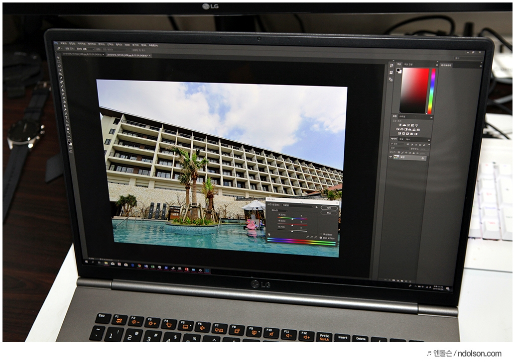 윈도우 설정에 보면, Windows HD Color : HDR 및 WCG 비디오, 게임을 보다 밝고 생생한 화질로 감상할 수 있게 해주는 기능이 있습니다. 해당 기능도 켜고 그램 17 노트북으로 포토샵에서 작업을 하면 색감이 더 좋습니다.