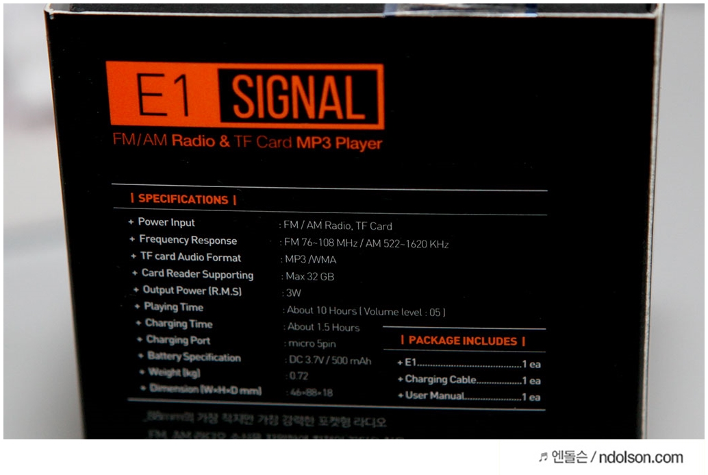 캔스톤 E1 시그날의 주요 스펙을 보면, FM/AM 라디오를 들을 수 있고, MircroSD를 삽입하여 MP3를 들을 수 있습니다. FAT32로 포멧된 마이크로SD를 지원하며, 최대 32GB까지 지원됩니다. 플레이 시간은 10시간(볼륨 5기준)으로 사용가능하며, R.M.S 3W가 탑재되었습니다.