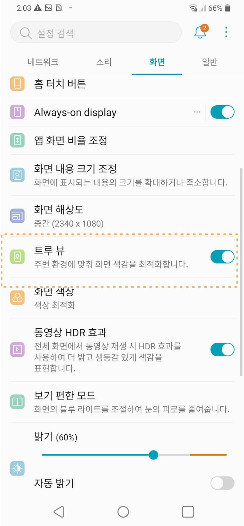 설정 > 화면 > 트루 뷰 기능을 켜두면, 주변의 환경에 맞는 최적화된 색감을 보여줍니다. 이런 설정은 올해 출시된 LG전자의 올레드 TV에서 주변 환경에 따라 소리, 영상을 최적화하는 인공지능 기술과 비슷하다는 생각이 들었습니다.