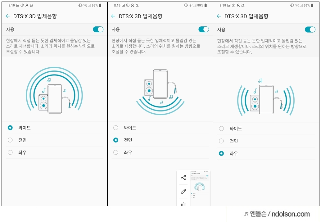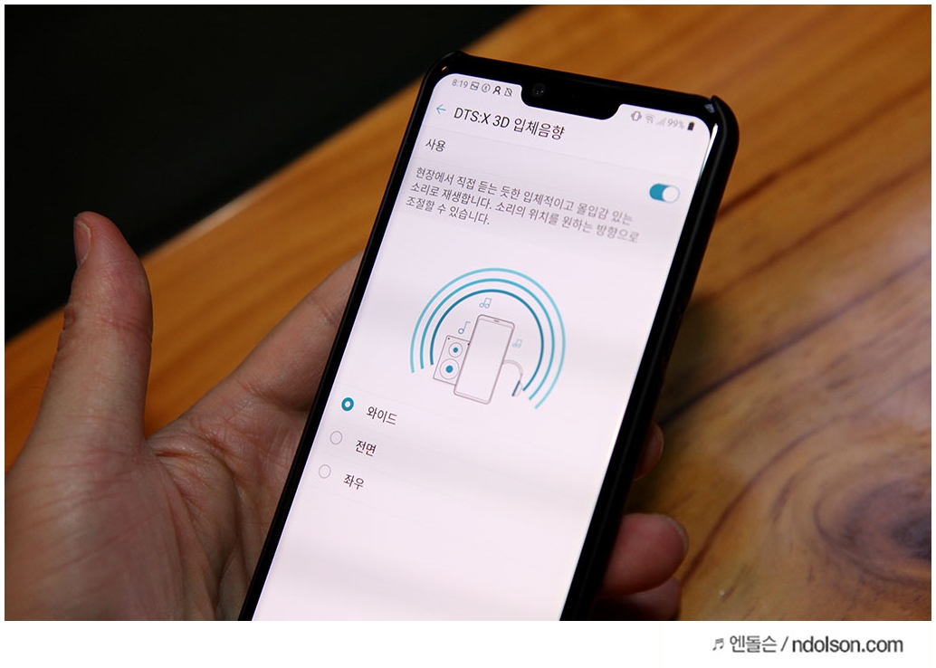 자체 스피커로 사운드 감상을 할 때도 입체적인 음향 감상을 지원합니다. 와이드, 전면, 좌우 옵션에 따라 음악을 듣는 느낌을 달리 해줍니다.