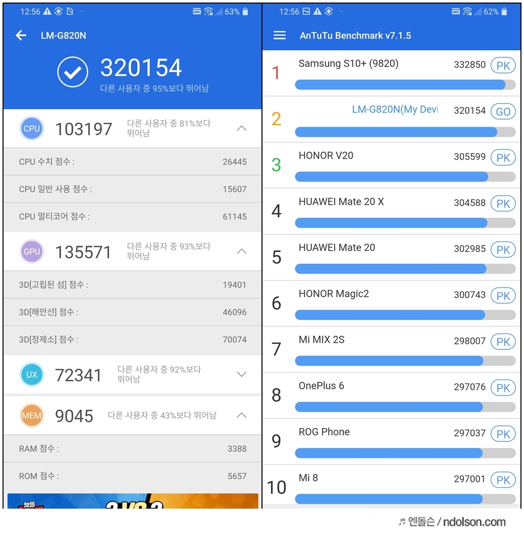 안투투벤치마크 결과 320154점을 기록하였습니다. 랭킹은 신규폰 출시에 따라 차이가 나지만, 갤럭시 S10+ 바로 밑이군요.