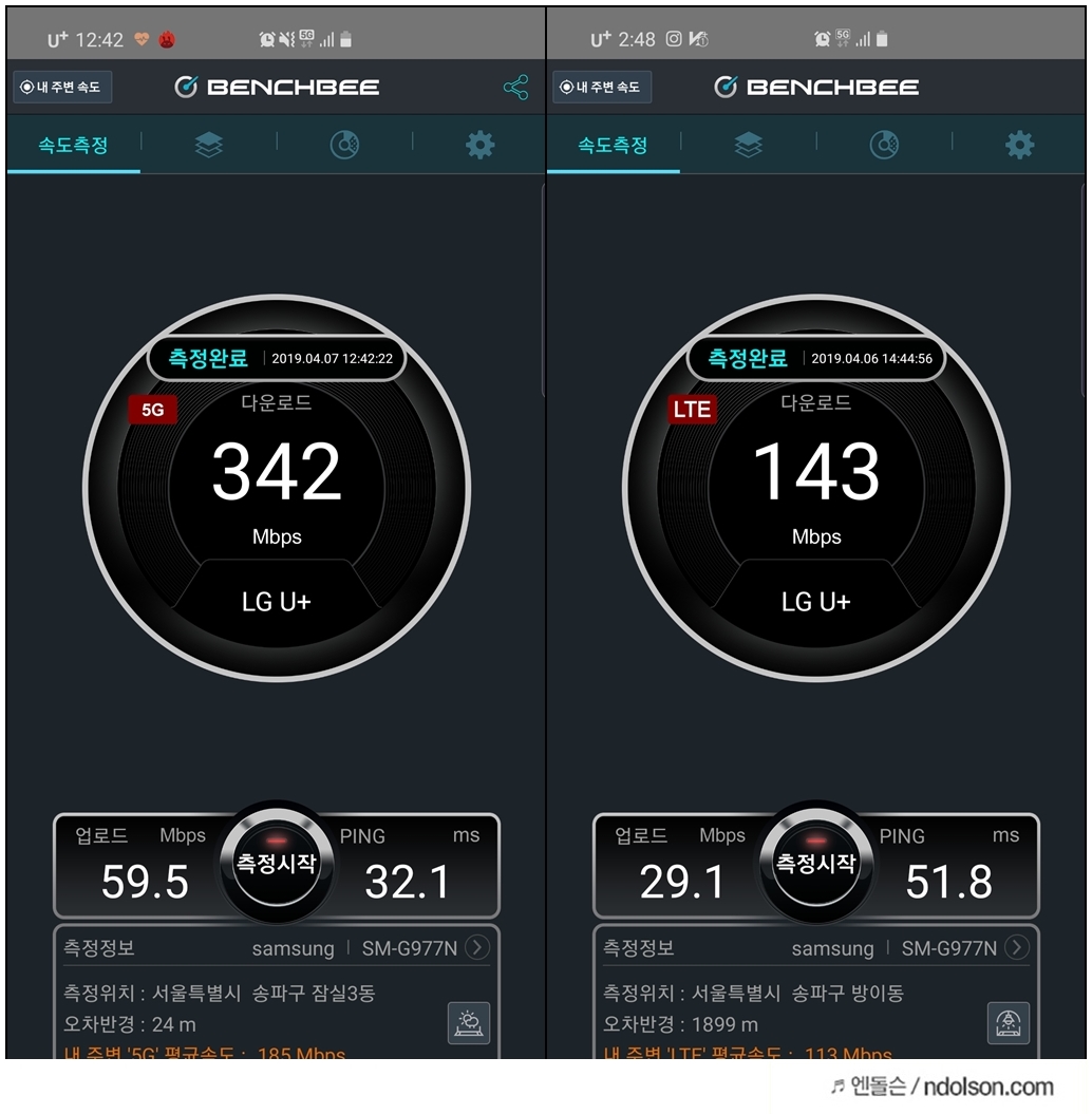 하지만 보통 야외에서는 5G이면 속도 차이가 컸습니다.
