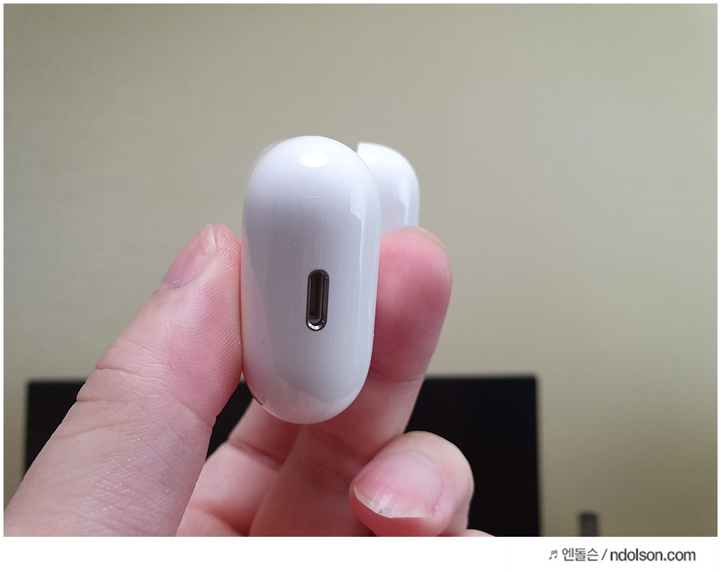 하단에는 유선 충전 단자가 존재합니다. 큰 변화는 없지만 에어팟1을 상당히 만족하고 사용하였기 때문에 이번에도 후회는 없습니다. 에어팟2의 가장 큰 장점은 음성 전화통화에 음질이 최강자라는 것입니다. 잡음이 없습니다.