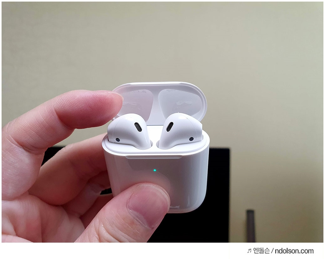 에어팟2의 디자인 변화는 크게 없었습니다. 충전상태를 표시하는 LED가 상위로 올라가서 눕혀 두어도 알 수 있게 되었습니다.