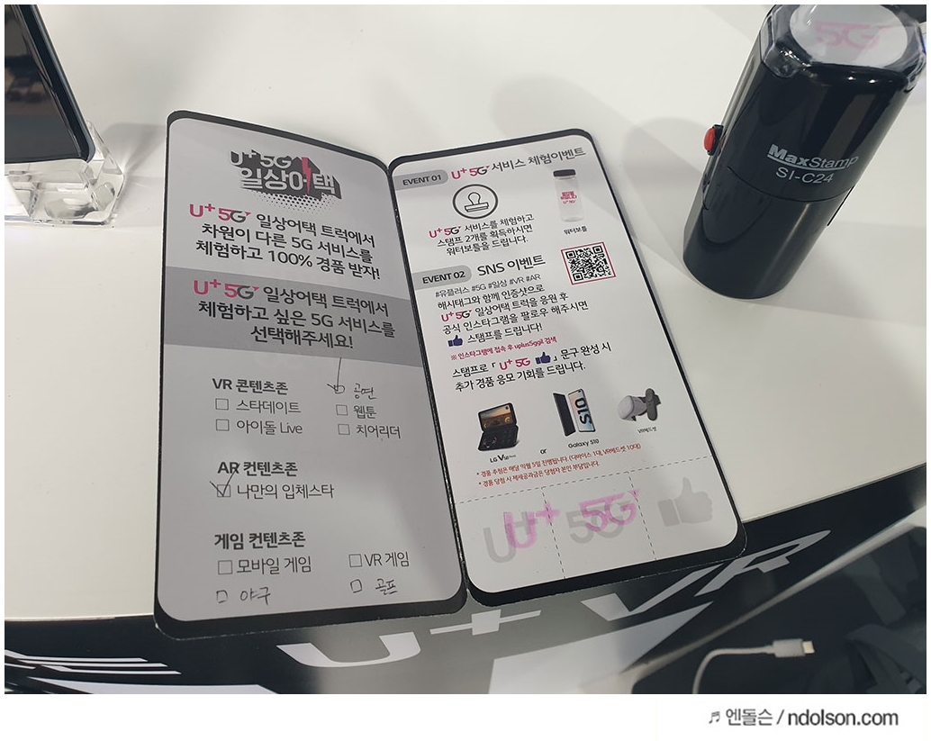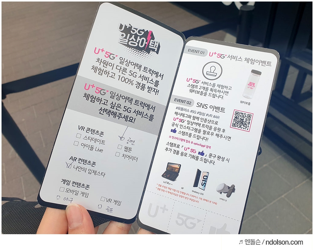5G 서비스를 모두 체험하고 스탬프 모두 받았습니다. 그리고 LG V50 ThinQ 또는 갤럭시 S10 5G 스마트폰 응모권도 얻었습니다. 되어라~ 되어라~