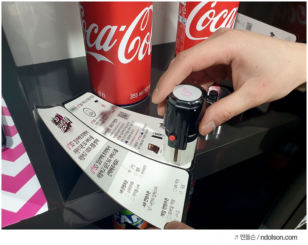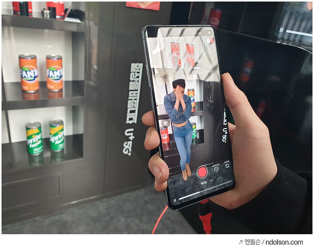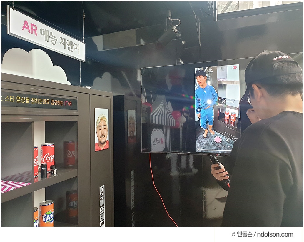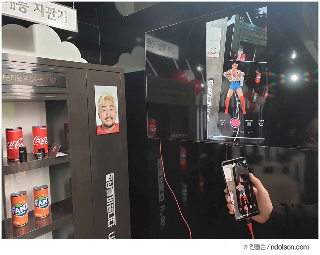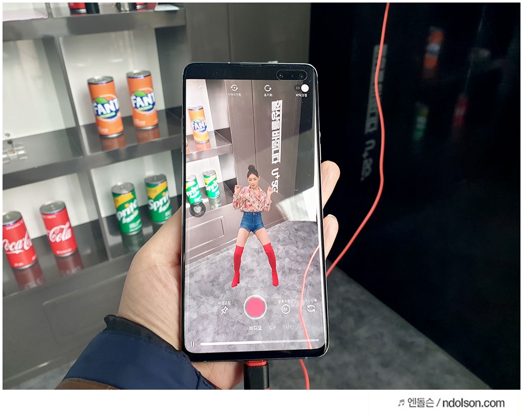그다음에 체험한 것은 U+AR이였는 데요. 증강현실이라고 현실세계에 컴퓨터 그래픽을 입힌 거예요. 내가 좋아하는 아이돌이나 연예인이 나오는데요. 바닥을 인식해서 실제 존재하는 것처럼 나오는 리얼 사실감을 느낄 수 있었습니다.
