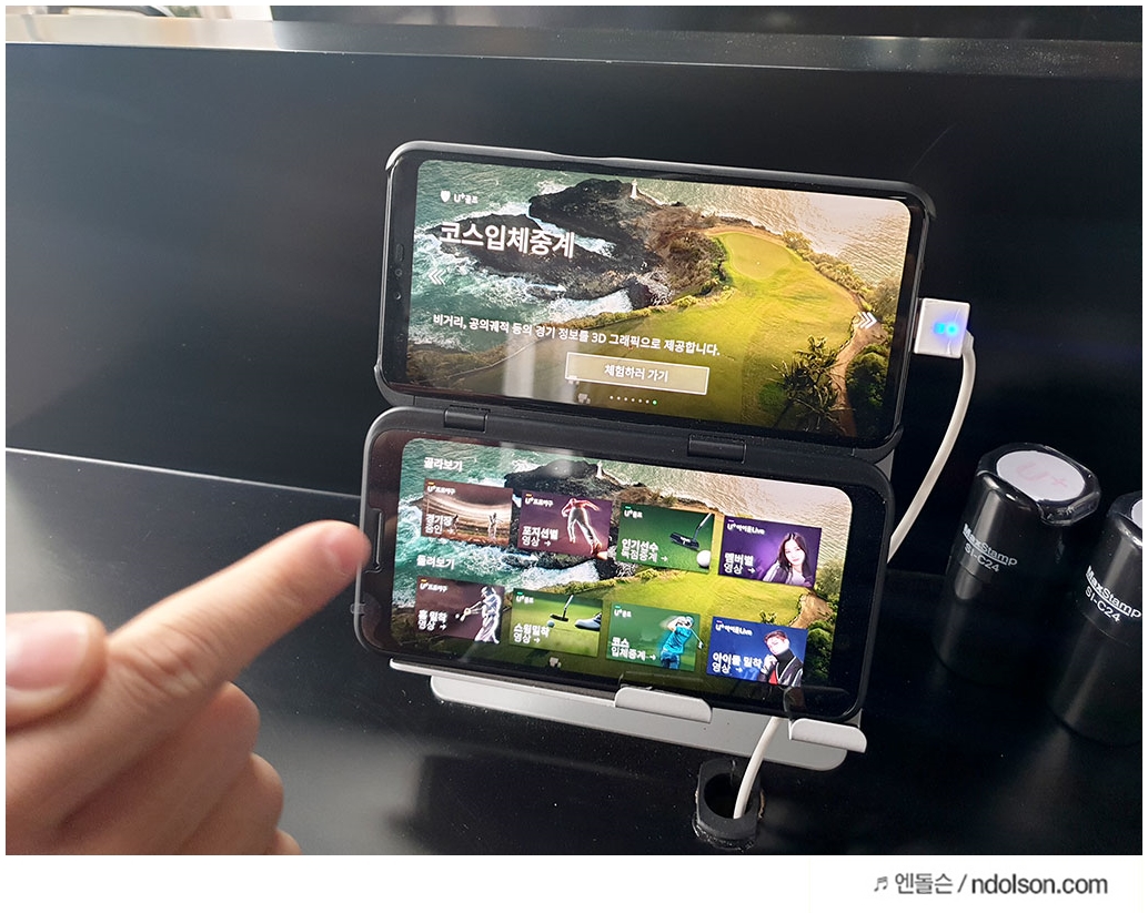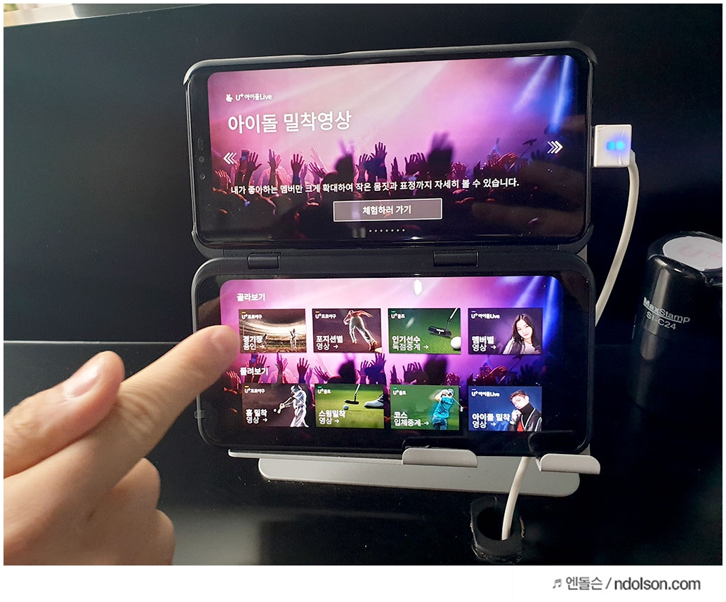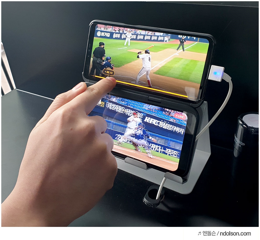 와~ 이게 화면이 두 개 달린 V50 듀얼스크린입니다. 올레드 6.2인치의 추가 화면을 통해서 U+프로야구, 아이돌 라이브 앱, 골프 등을 즐길 수 있었습니다.