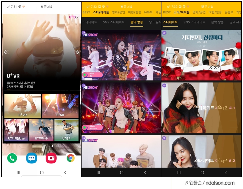 THE SHOW 음악프로를 VR로 보면, 나가 좋아하는 아이돌이 눈앞에 있는 것만 같습니다. 또 여자들이라면 설렐 얼굴 천재, 차은우와 함께 하는 스타데이트, 손나의의 스타데이트는 1인칭 시점으로 나와 정말 이야기하는 듯한 재미도 즐 길 수 있었습니다.