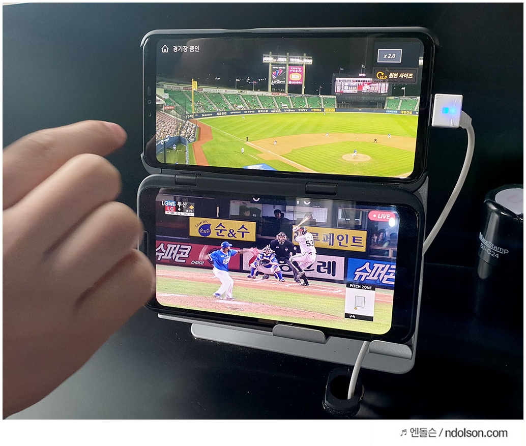 그래서 LG V50 ThinQ는 LG 듀얼스크린을 이용해서 화면을 2개로 제공해준다고 합니다. 프로야구, 아이돌 라이브, 프로골프 등을 생방송 보면서도 다른 서브화면에서는 또 다른 화면을 보여줍니다. 1개의 앱이 2개의 창으로 보여주는 것인데요.