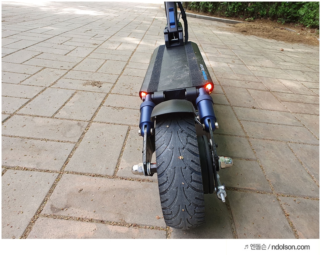 정말로 이전에 쓰던 전동킥보드 보다 서스펜션 있는 아이나비 전동킥보드가 승차감에 있어서는 훌륭했습니다. 개봉 후 뒤에서 보던 모습이 디자인에 있어서도 가장 멋지다고 생각합니다. 뒤태가 멋진 거 보소!