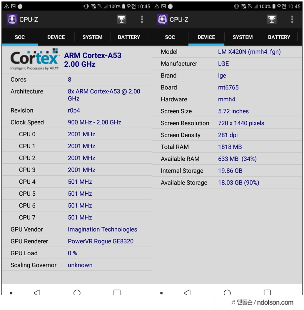 CPU-Z의 상세 정보도 같이 첨부합니다. LG X4 2019 스펙 리뷰에 참고하여주세요.