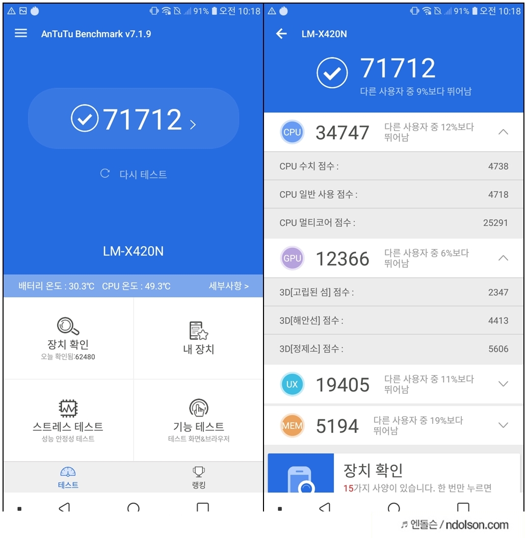 LG X4 2019의 벤치마크 점수는 71712점을 기록하였습니다. 보급형 스마트폰이라 성능에서는 큰 점수를 획득하지 못하였지만, 실사용에서 생각보다 느리지 않은 정도였습니다.