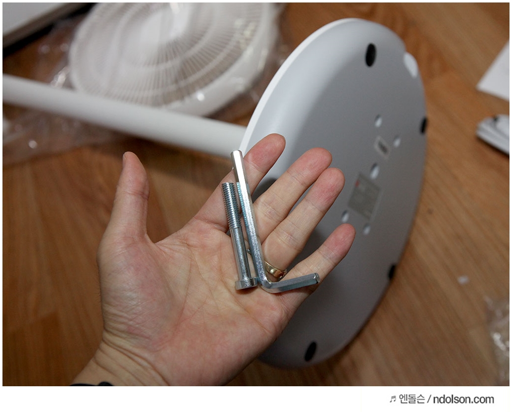 샤오미 선풍기 조립에 필요한 육각모를 제공하여 줍니다. 우선 선풍기의 기둥을 세워야 합니다. 긴 나사를 이용하여 받침대와 기둥을 연결하여 샤오미선풍기를 조립하여 줍니다.