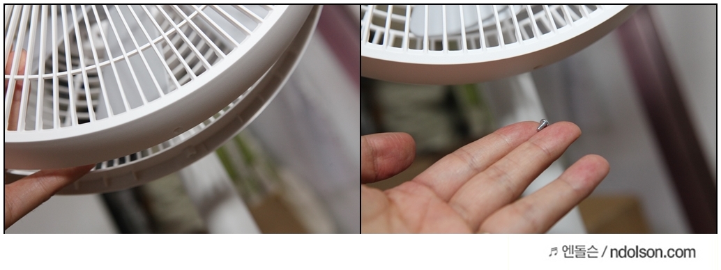 선풍기 날개의 커버가 빠지지 않게 나사로 단단히 조여 줍니다.