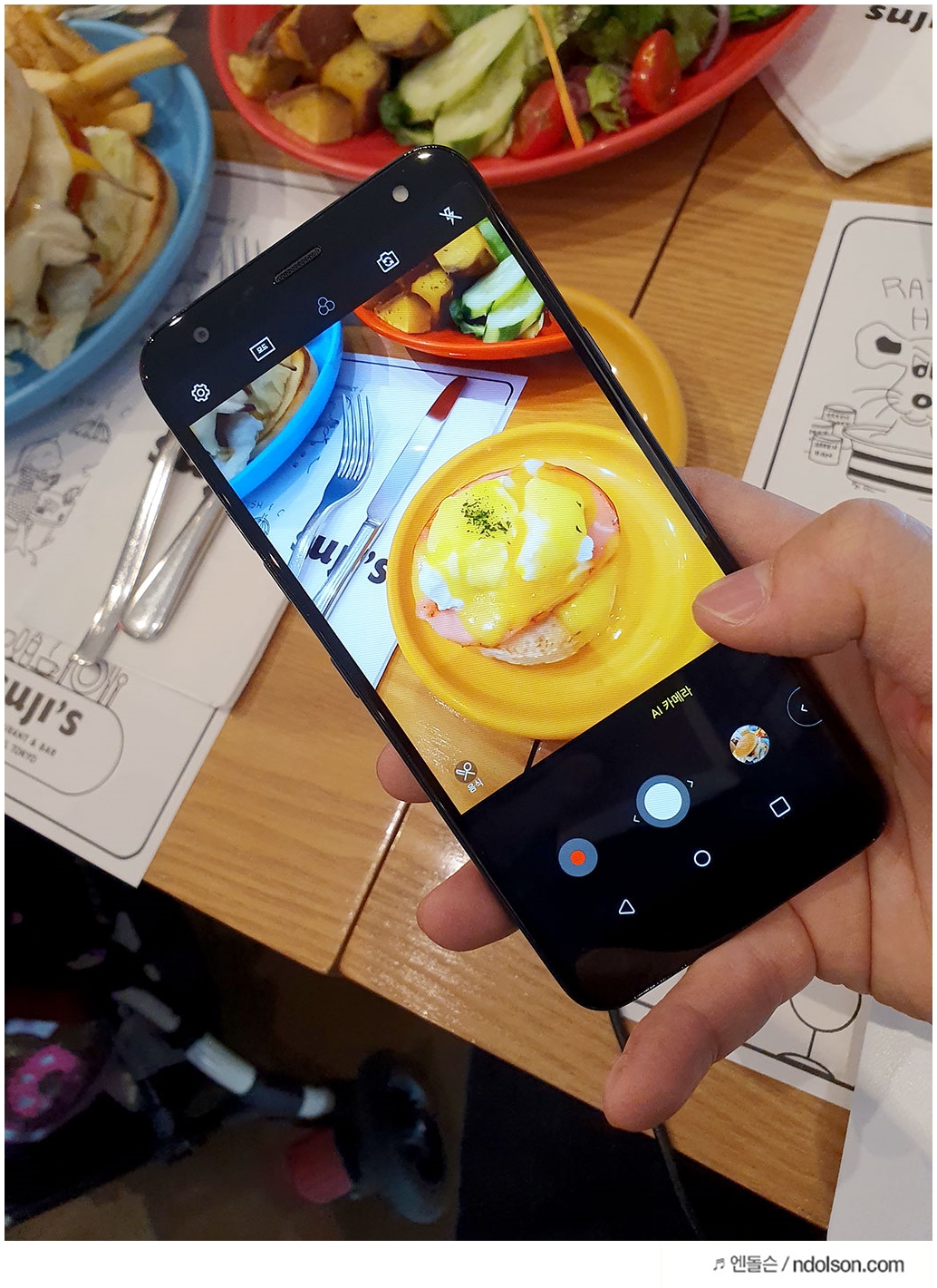 인공지능인 AI카메라는 인물 / 풍경 / 반려 동물 / 음식 / 도시 / 꽃 / 일몰 / 일출의 8가지 모드를 인식합니다. 카메라 앱을 켜면, Q렌즈와 AI카메라 설정이 나오면 AI카메라 설정을 누르면 최적의 모드로 동작하게 됩니다.