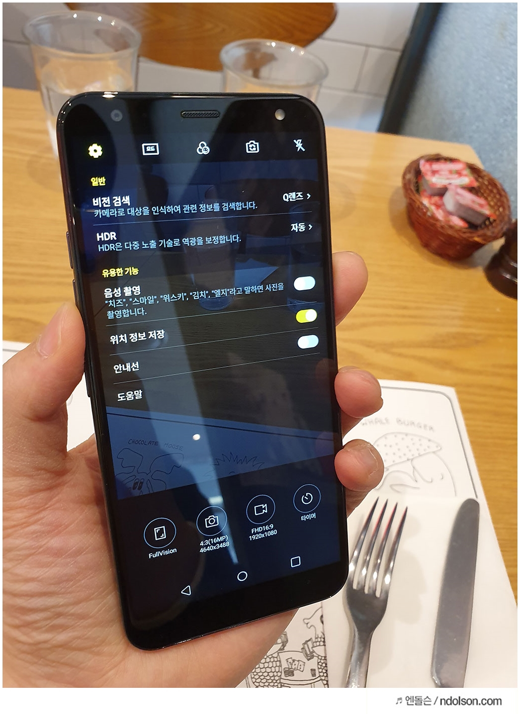카메라 설정의 옵션입니다. PDAF를 지원하여 AF가 정확하며, HDR지원으로 역광에도 보정이 됩니다. 그 외 음성 촬영도 지원되어 김치, 위스키, 스마일 등의 음성을 불러도 촬영이 가능합니다.