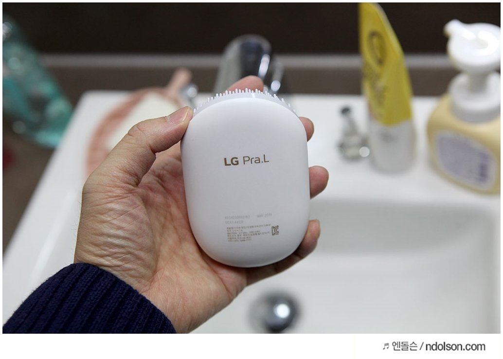 그렇습니다. 역시 이나영 마스크로 유명한 LG전자가 만든 미용제품 LG Pra.L입니다. 크기는 작고 동글동글 했는데요. 한 손에 쥘 수 있는 그립감이 좋았습니다. 화이트 색상에 깔끔한 느낌으로 180g의 가벼운 무게였습니다.