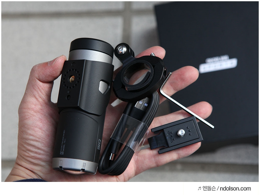 우선 아이나비 자전거 블랙박스 TC-1의 구성품입니다. 액션캠과 고정대, 육각모 2개의 공구, 액션캠과 쉬운 분리는 위한 액세서리로 구성되어 잇습니다.