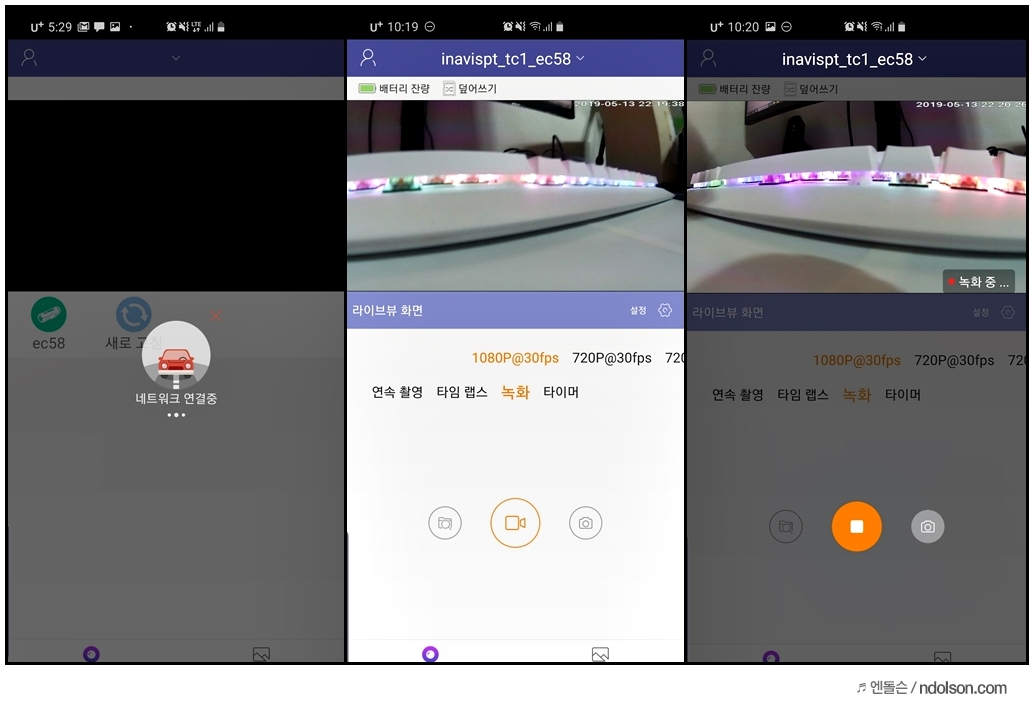 앱 화면에서 ec58 장치를 눌러서 연결해주면 라이브로 볼 수 있습니다. FHD 1080p 화질로 녹화가 가능하며, 30프레임 녹화가 가능합니다. 더욱 긴 녹화시간을 위한다면 720p 녹화 설정으로 하셔도 됩니다.
