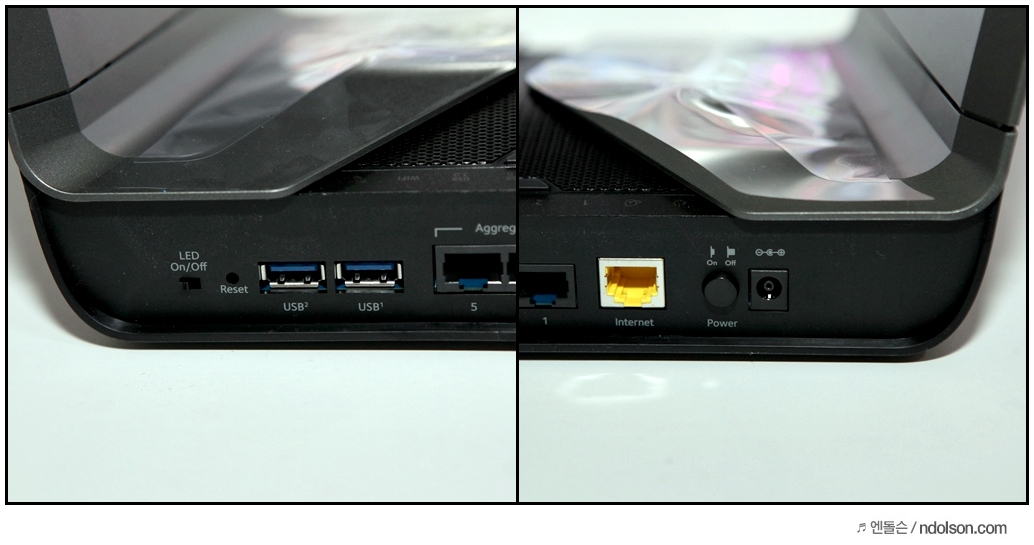 후면에는 야간 취침시 LED 라이트가 신경 쓰이면 OFF/ON 할 수 있는 스위치가 있습니다. 또 유무선 공유기의 USB 3.1 포트가 있어 공유기에 파일 공유기 가능하게 되어 있습니다. 외장하드나 USB 스틱을 연결하기에 편리합니다.
