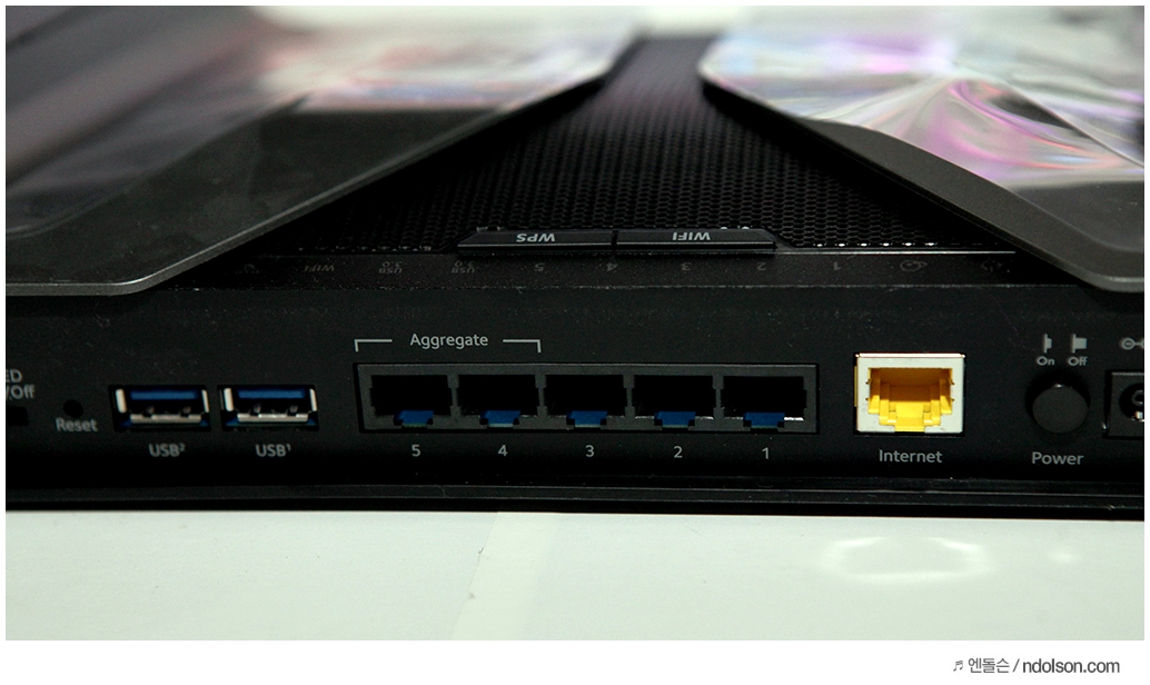 또 1~5까지 LAN 포트가 있습니다. 그중 4/5 포트는 Aggregate(어그리게이션) 기능을 지원하는 데, 최대 2Gbps 회선을 확보할 수 있습니다. 그렇기 때문에 대용량의 파일을 빠르게 전송하거나 데스크톱 PC의 빠른 인터넷을 위해서 연결해두면 좋습니다.