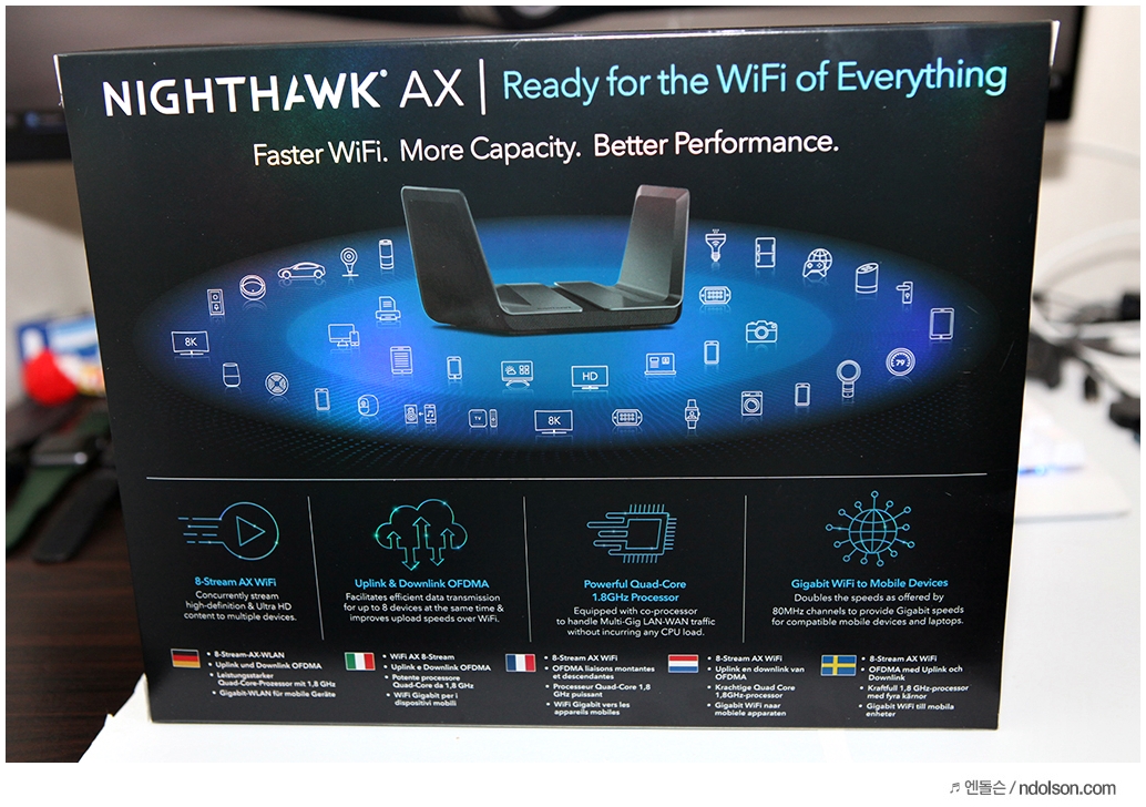 무엇보다 넷기어 나이트호크 RAX80은 점점 늘어가는 IoT 기기의 다수를 지원할 수 있는 쾌적한 무선 환경을 제공합니다. 회사, 집, 카페에서 커버리지 높은 품질의 와이파이 무선환경을 구축할 수 있는 넷기어 RAX80 입니다. 성능에 있어서는 무선공유기 중에서는 최고라는 겁니다.