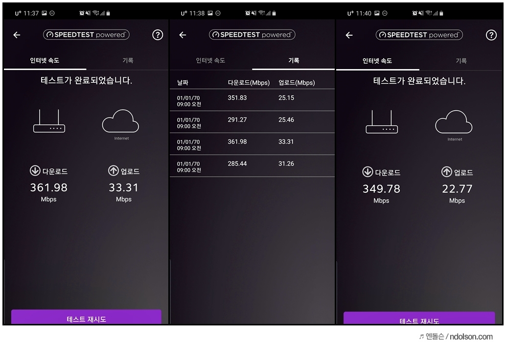 우선 거리에 대한 와이파이 속도 테스트입니다. 거실에 있는 공유기 기준으로 이전 DW: 18.6Mbps 에서 DW: 39.4 Mbps로 향상되었습니다. 그다음 넷기어 RAW80 인터넷 속도 테스트를 해보니, 다운로드 361.98 Mbps, 업로드 33.31 Mbps를 기록하였습니다. (최대 2.4GHz /5 GHz로 6Gbps를 전송하니, 필자의 인터넷 환경이 느린점을 참고해주세요.)