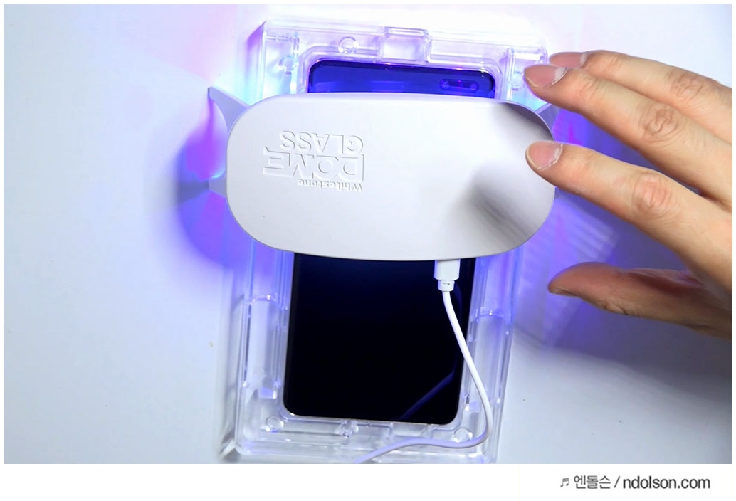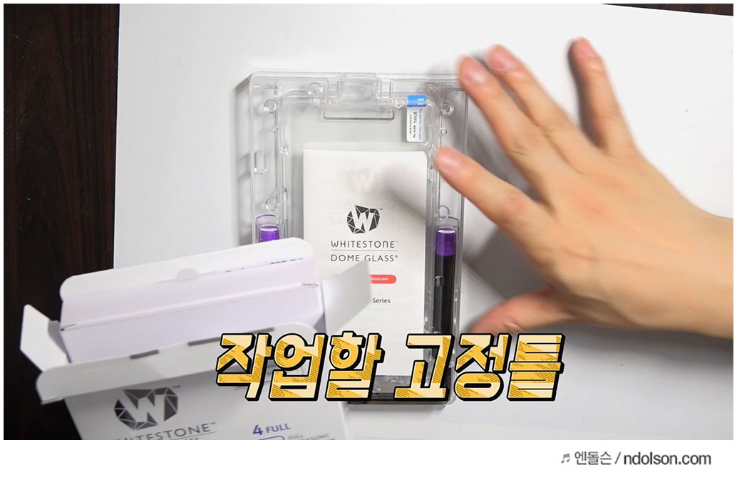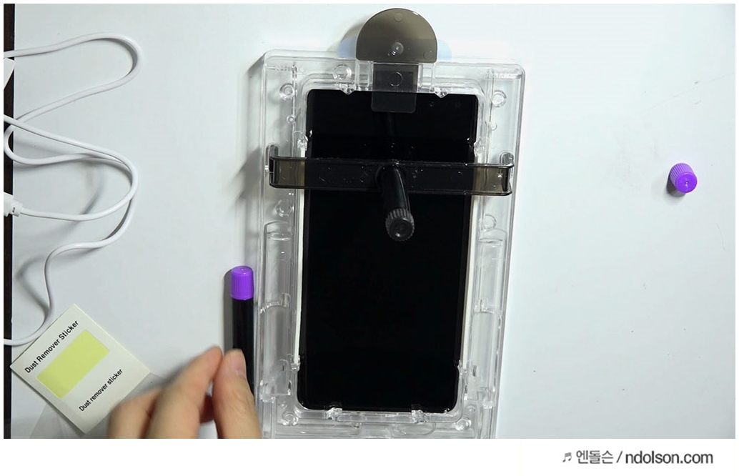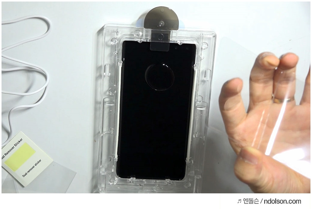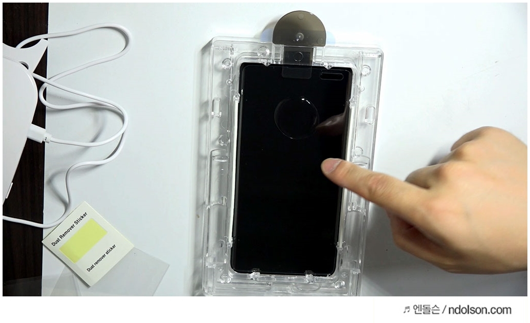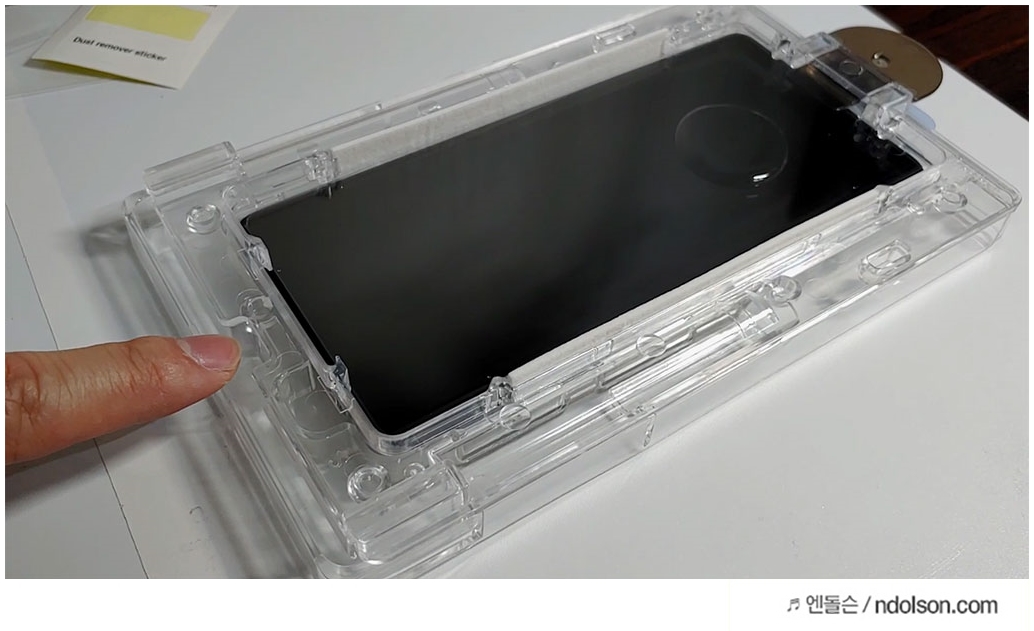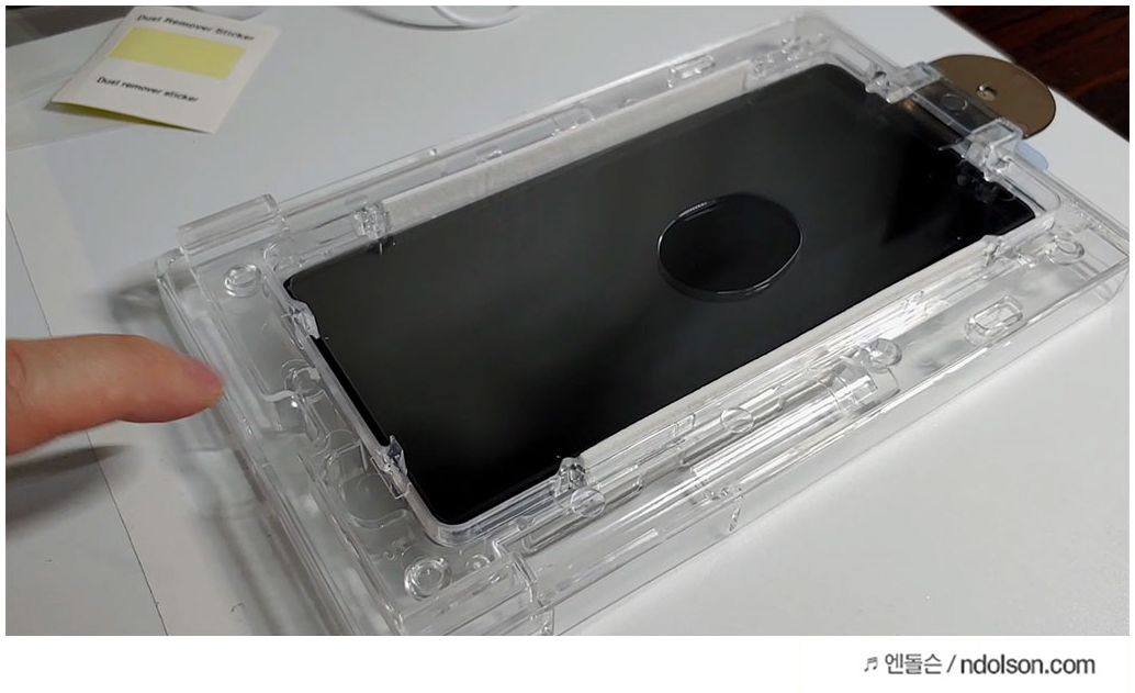 돔글라스 강화 필름을 올려 줍니다. 바로 붙지 않고 고정핀에 걸쳐져 있습니다.