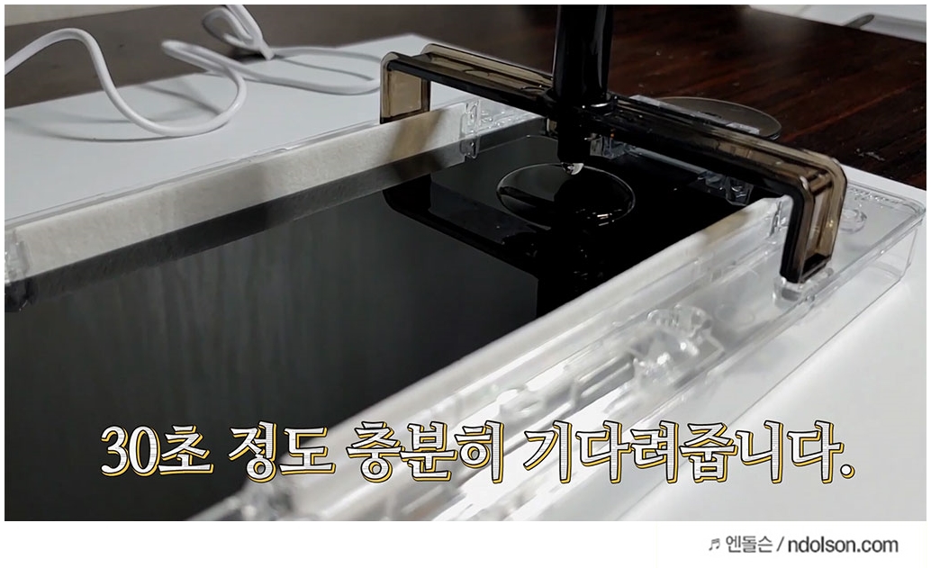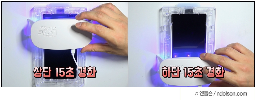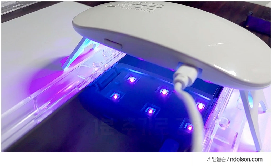 다시 상단 1분, 하단 1분으로 UV램프로 경화를 합니다. UV램프는 켜 두면 1분이 지나면 알아서 꺼지니 시간 계산하기 어렵지 않습니다. 또 1분이 넘어도 되니 괜찮습니다.