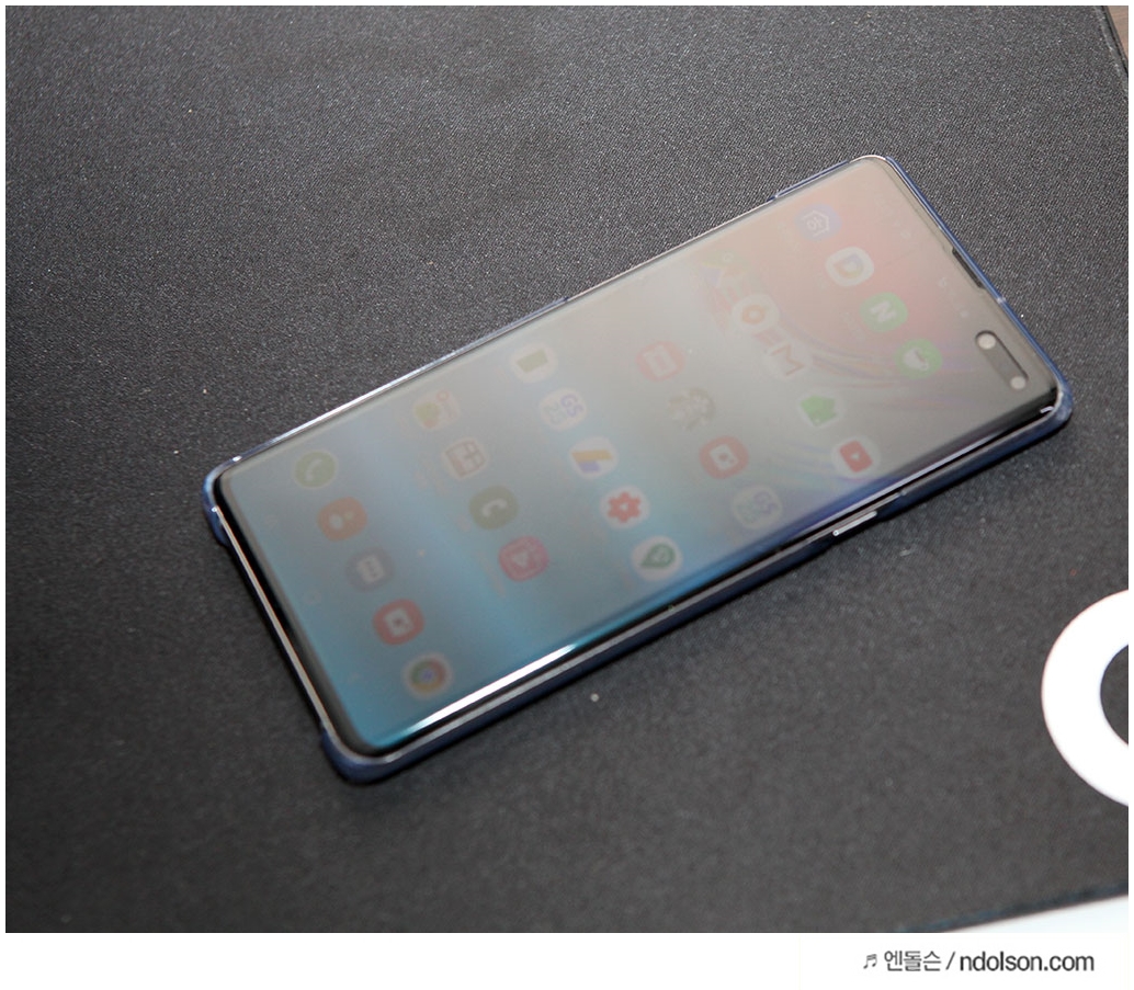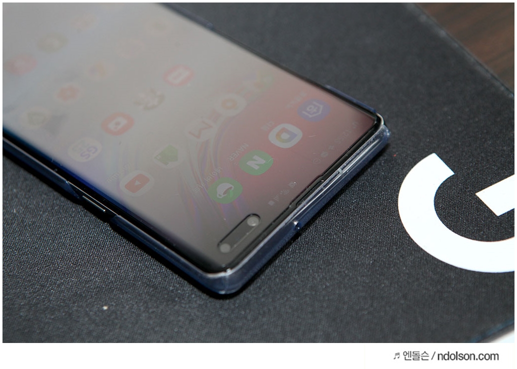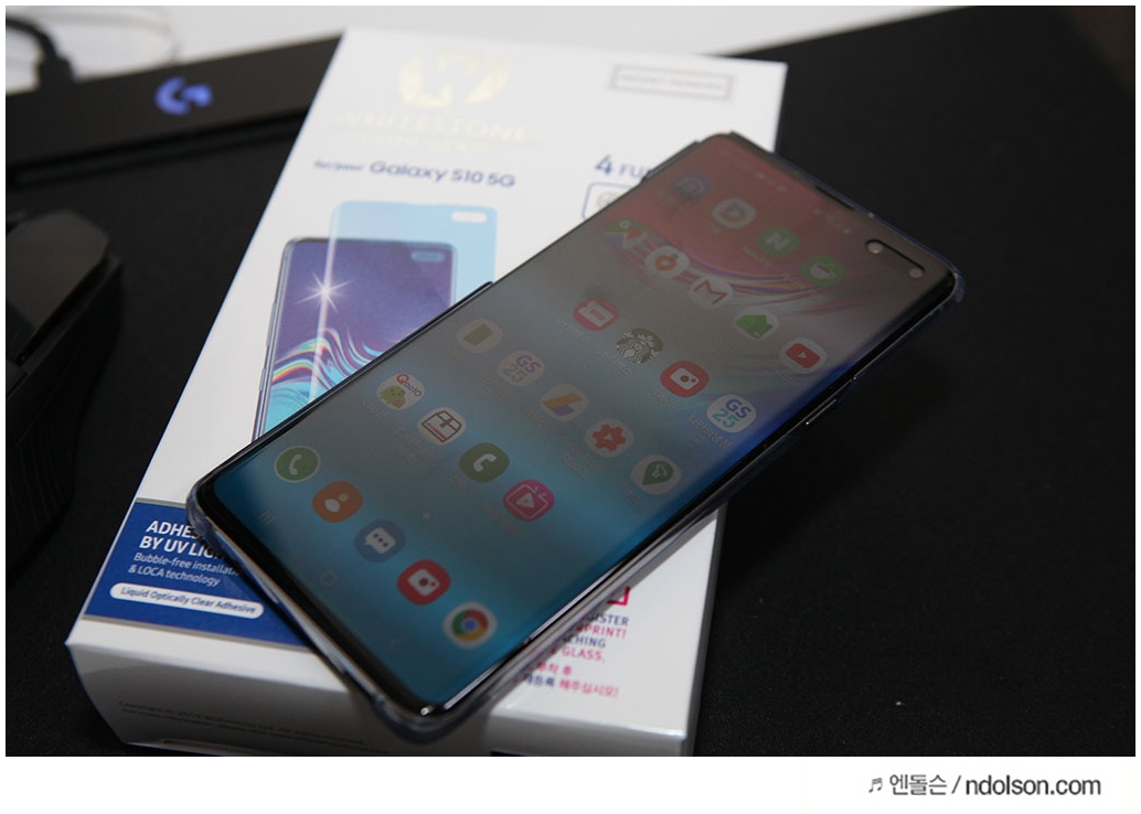 갤럭시 S10 5G 강화유리로 돔글라스 제품을 선택하였습니다. 부착된 모습을 보면, 기포 하나 없이 깔끔하다는 것을 알 수 있습니다.