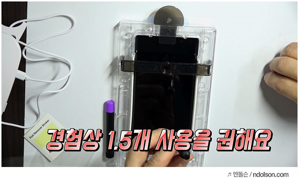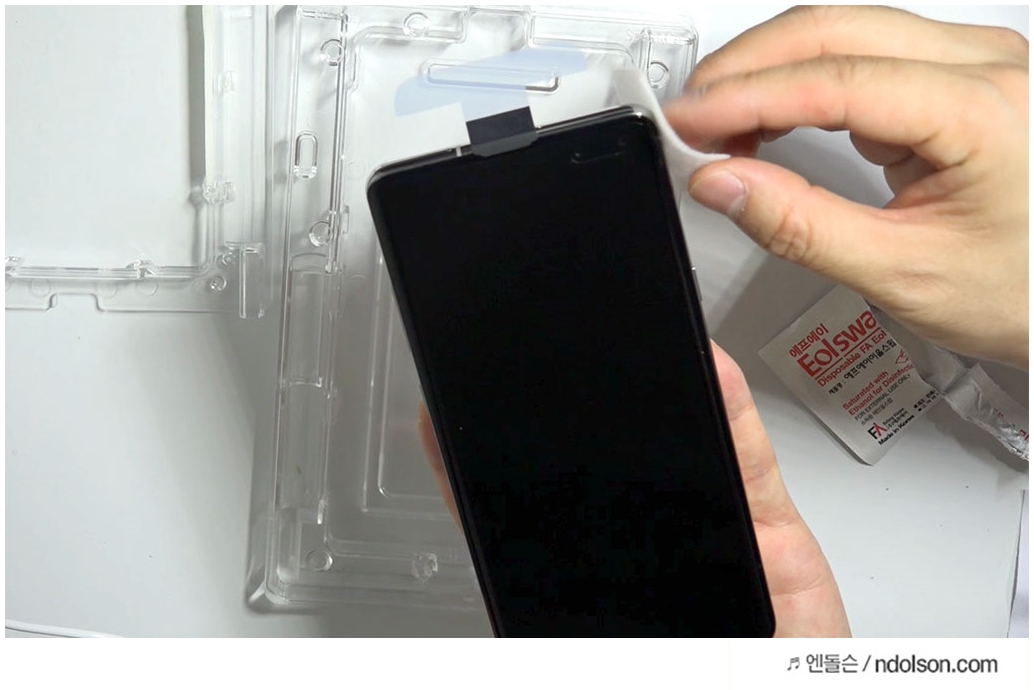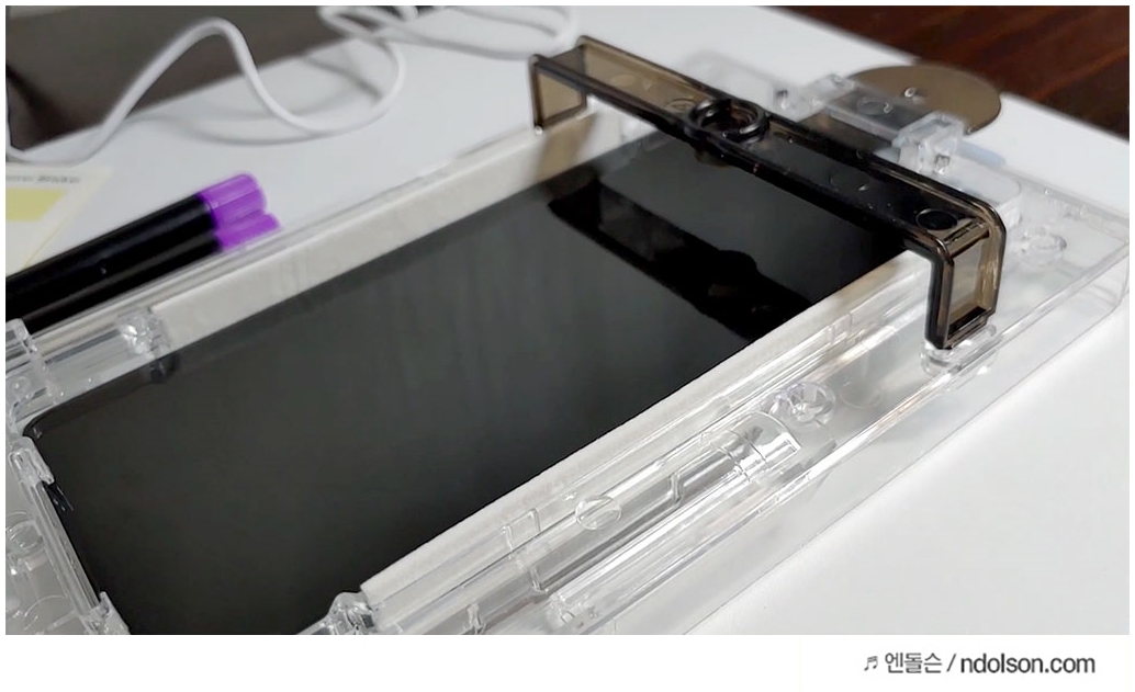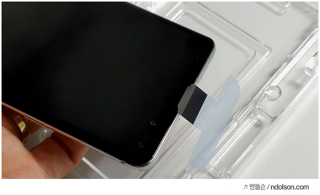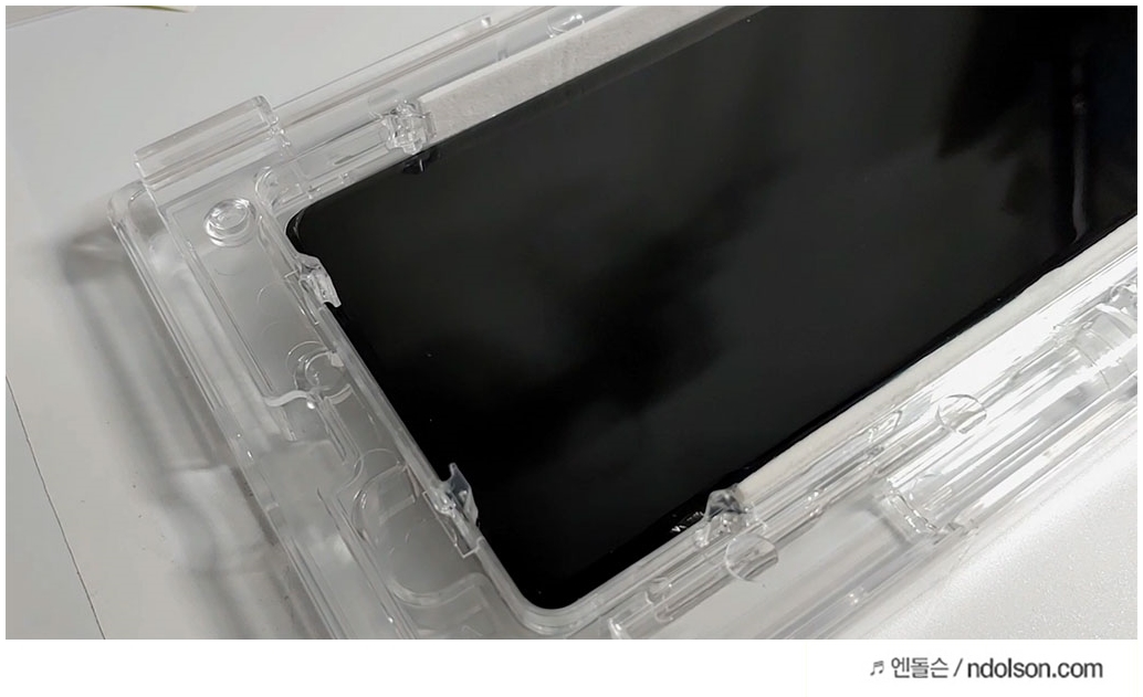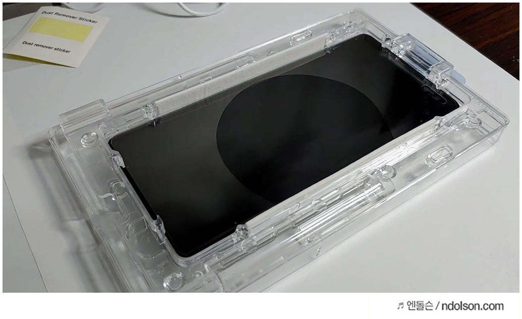 다른 강화유리도 써보았지만, 양면테이프 방식으로 붙이는 것은 부착 방법이 쉬워보이지만, 잘 떨어지고 완벽하게 디스플레이와 싱크율을 보여주지 못합니다.