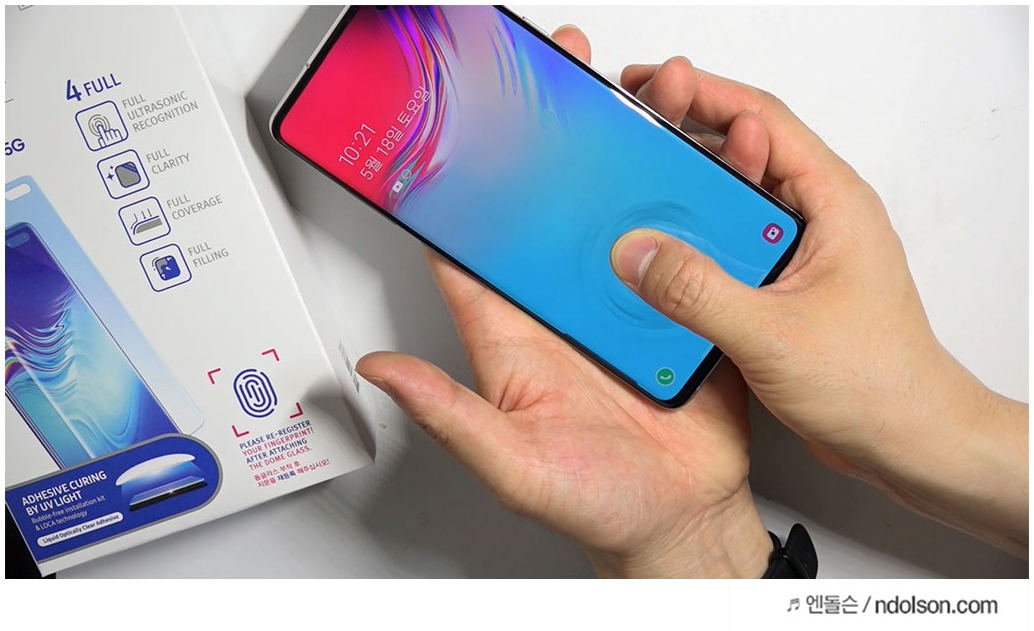 (위 : 갤럭시S10 5G 강화유리 보호필름 부착 모습)