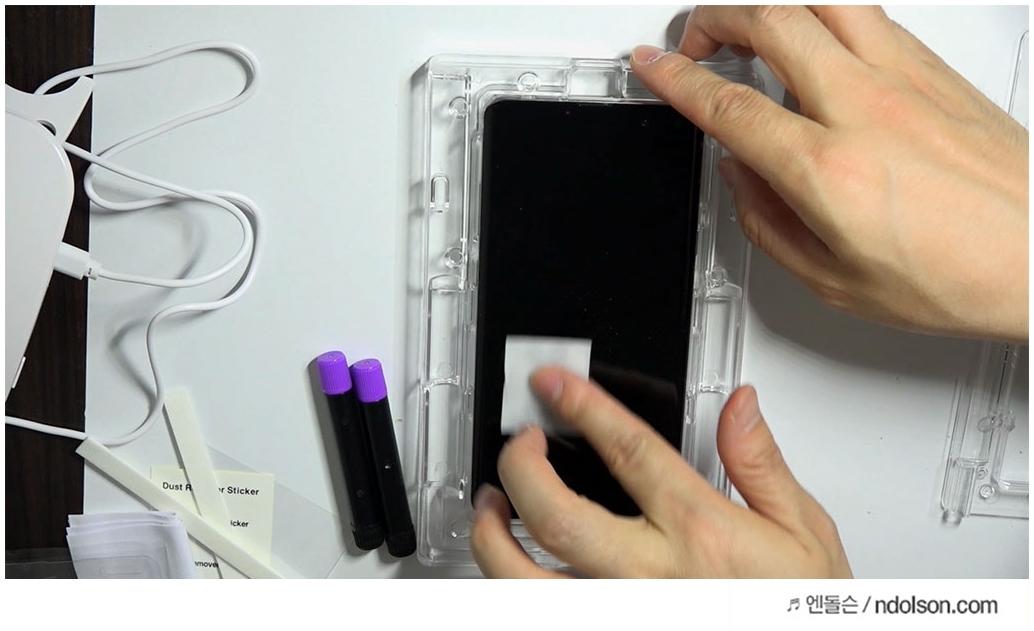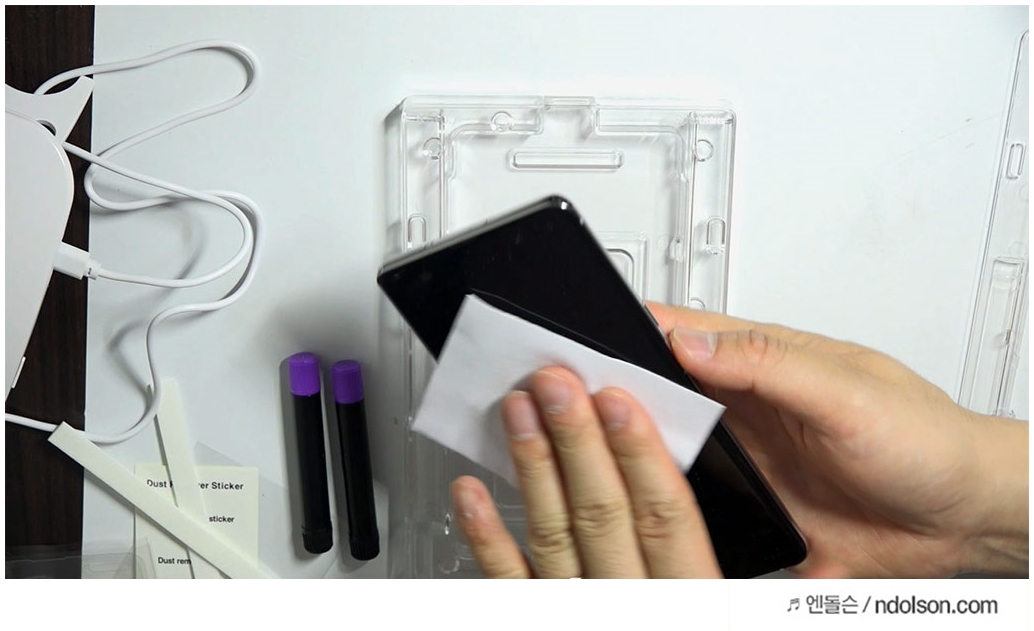 이때까지 과정을 하면서 먼지가 붙었습니다. 이물질 제거 스티커를 이용하여 디스플레이에 있는 먼지를 찍어서 제거합니다.
