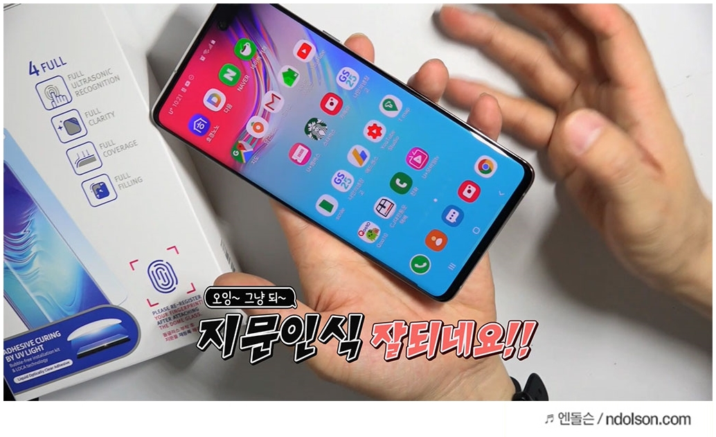돔글라스 강화유리를 갤럭시S10 5G에 부착 후에도 지문인식은 여전히 잘 되는 것을 알 수 있습니다.