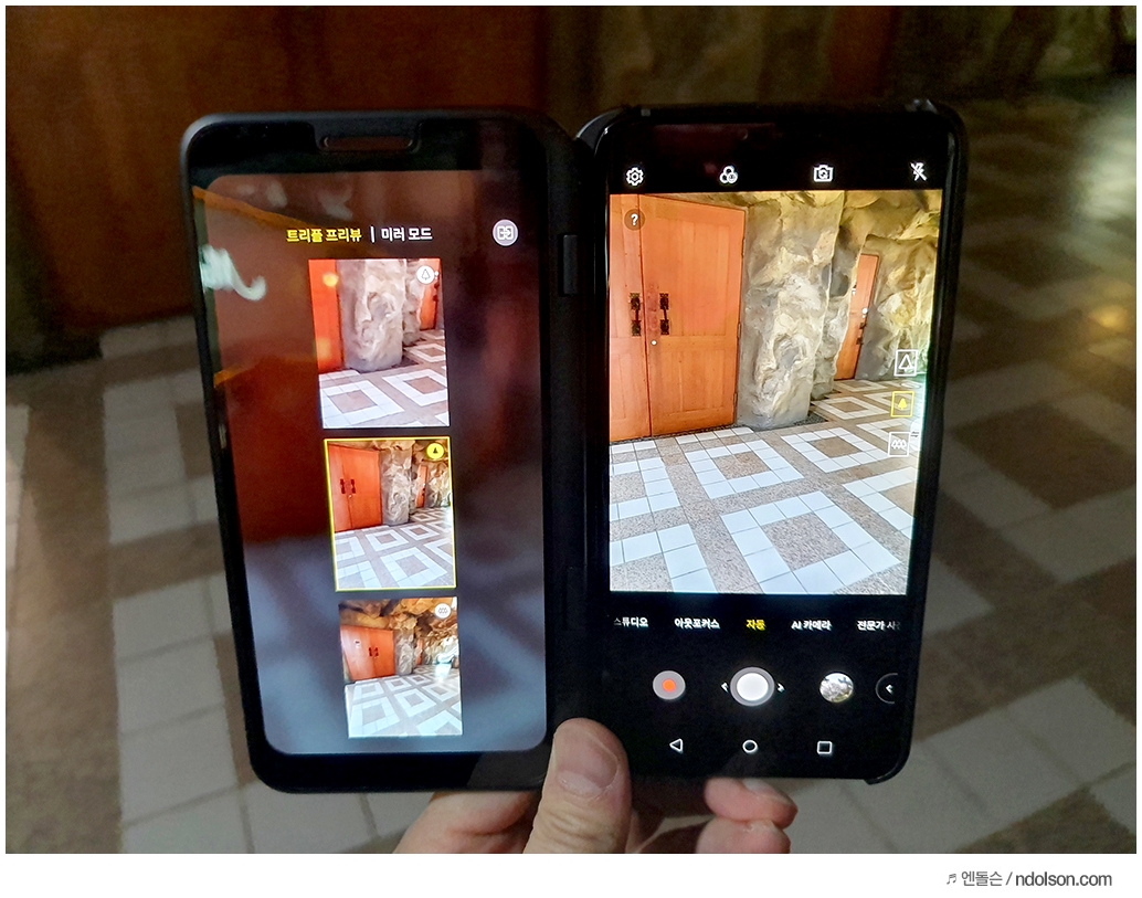 V50의 듀얼 스크린은 여닫을 수 있는 플립(Flip) 커버 안쪽에 6.2인치의 올레드 화면을 갖춘 액세서리입니다. 카메라 찍을 때는 트리플 프리뷰, 미러 모드를 사용할 수 있는데요. 트리플 프리뷰는 3개의 카메라로 미리 볼 수 있는 것이고, 미러 모드는 동일한 화면이 나와서 각도를 하이/로우 앵글로 잡아서 찍을 때 참 편합니다.