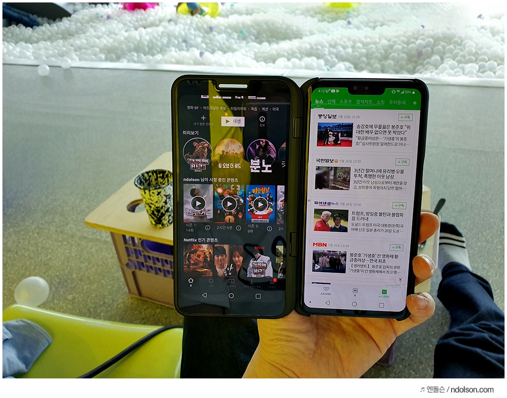V50 활용팁이라면, 넷플릭스 + 게임 조합은 넷플릭스를 터치해야 동작하고, 유튜브앱 + 게임 조합은 백그라운드를 지원해서 게임과 영상 보기가 동시에 됩니다.
