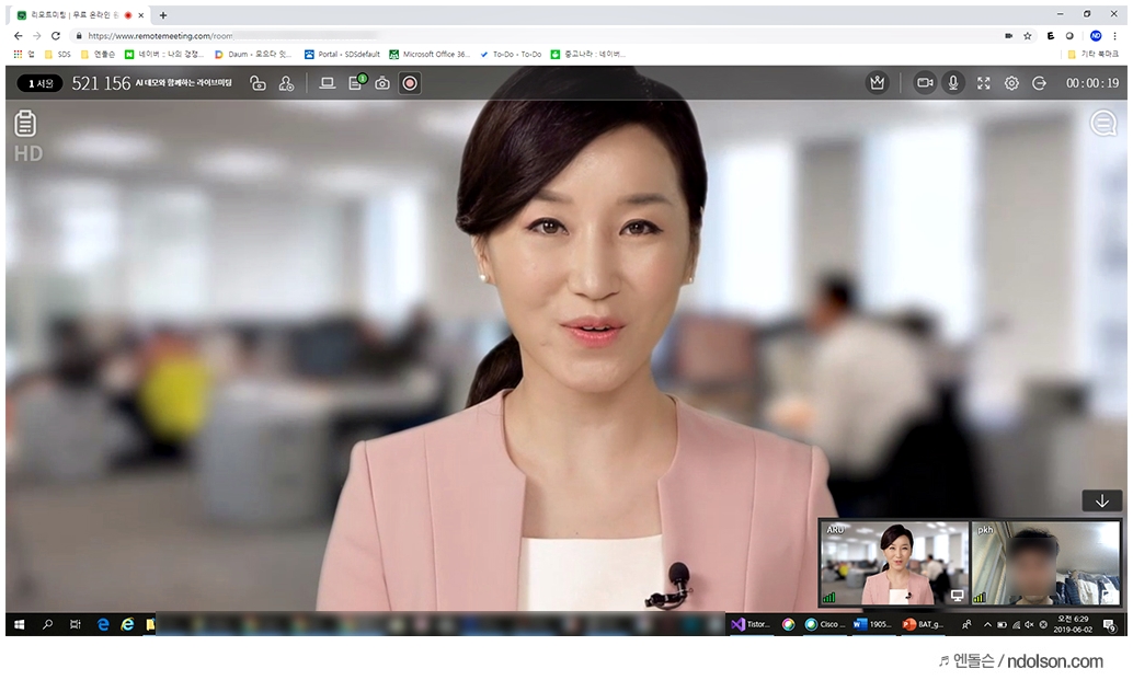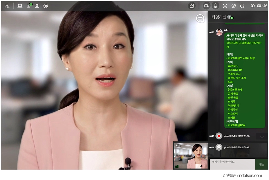 회의실에 입장하여 얼굴을 보면서 음성 대화와 채팅도 가능합니다. 화상회의는 이동시간에 대한 시간 절약과 글로벌 지사에 대한 미팅 회의 때 상당히 편리합니다.