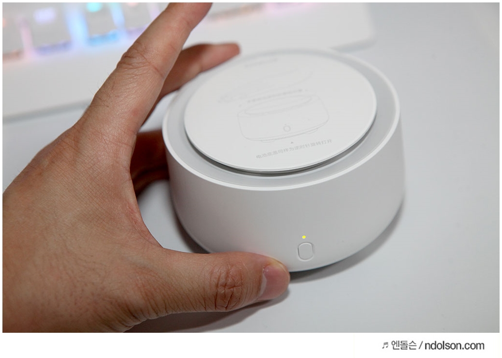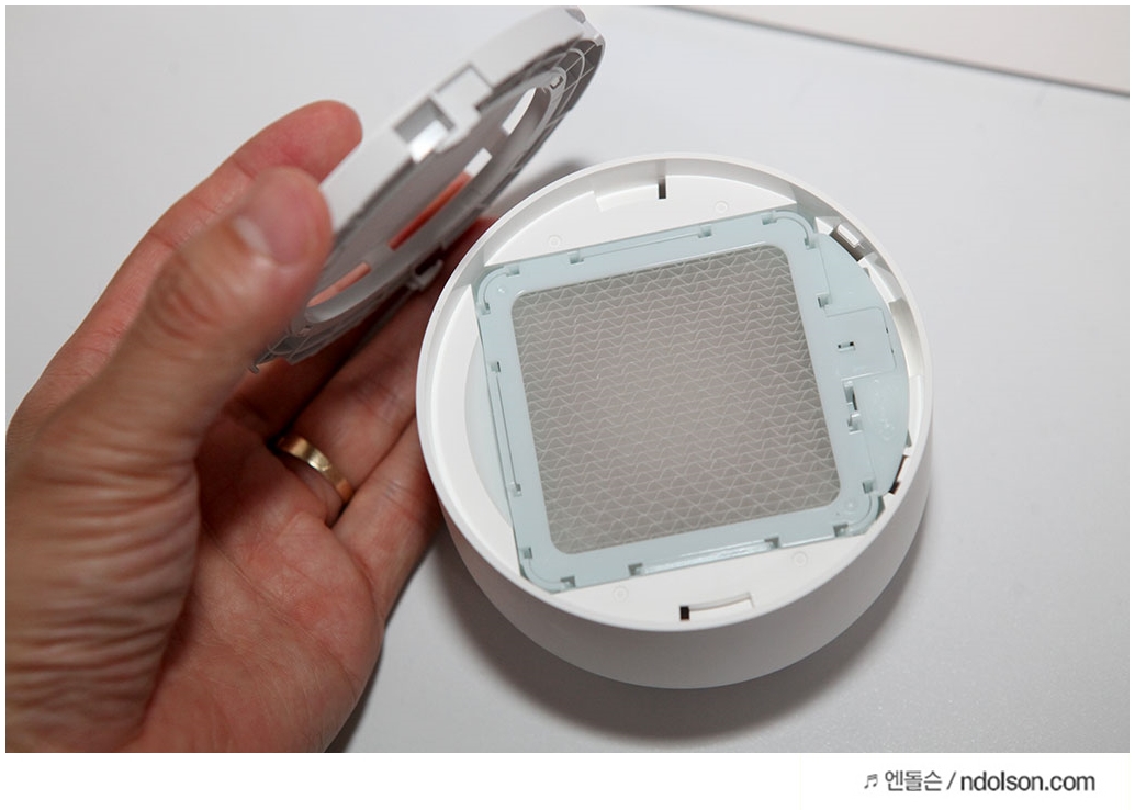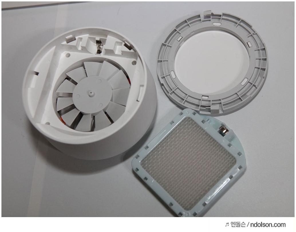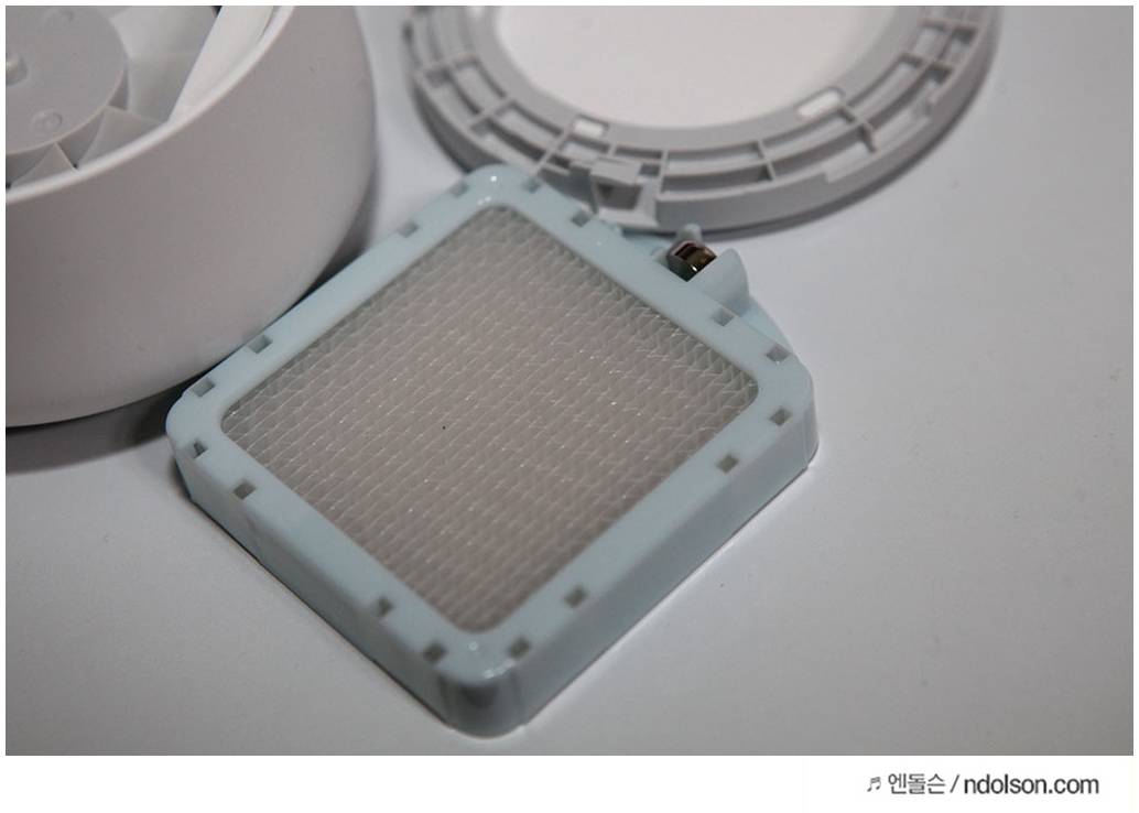 필터를 넣는 방향에 맞추어 넣어주면 됩니다. 작은 건전지가 필터에도 있는데요. 이 제품은 비가열식 제품으로 팬만 돌아가서 안전합니다.